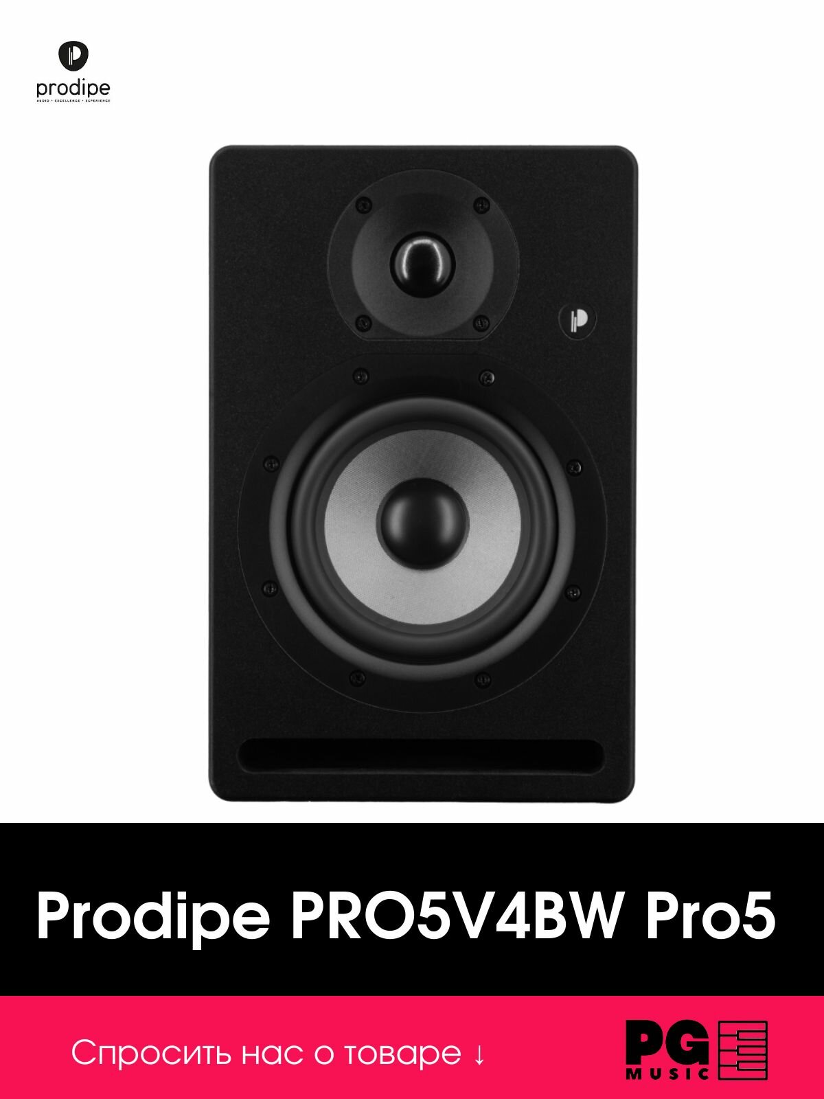 Студийный монитор 5" с двойным усилением 50 + 25 Вт RMS. Мощный, с двойным усилением (50 + 25 Вт RMS), оснащенный НЧ динамиком диаметром 13 см (5 дюймов) и фазоинвертором на передней панели, монитор Pro5 V4 гарантирует простое размещение в непосредственной близости от точки прослушивания. Оснащенный новым твитером с неодимовым куполом (1 дюйм) и новой электроникой, этот монитор даст еще большую скорость, динамику и присутствие.