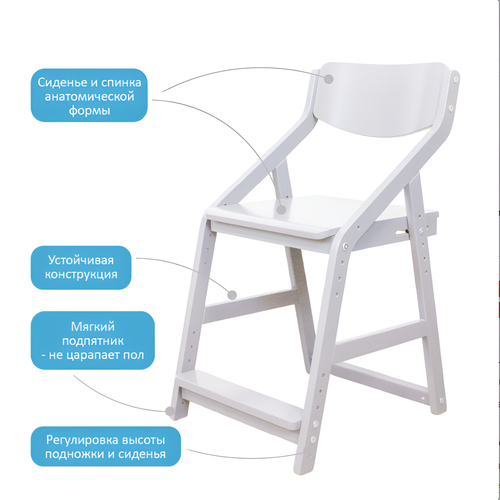 преимущества наших растущих стульев; 1 безопасность на первом месте, устойчивая конструкция и закругленные углы на всех деталях, стулья выдерживают вес до 100 кг; 2 здоровье, сиденье и спинка анатомической формы, обеспечение удобной посадки и правильной осанки; 3 стулья растут вместе с ребенком и прослужат долгие годы; 4 универсальность, регулировка сиденья и подставки для ног, стулья подходят как малышам, так и взрослым; 5 экологичность, стулья изготовлены из массива березы и экологически чистой фанеры; 6 легкая чистка; изготовлен из массива березы и березовой фанеры
