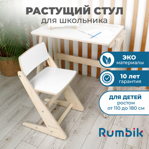 Регулируемый стул для школьника с настройкой высоты – это выгодное приобретение. Он прослужит долго, ведь такой классический ученический стул подходит даже для малышей 5 лет, а затем, по мере роста ребёнка, модифицируется до высоты сиденья 45 см (это обычный параметр стула для взрослых). Достаточный размер сиденья 39 см х 33 см удобен и для первоклассника, и для старшеклассника. Таким образом, стульчик для школьника Румбик Смарт будет востребован много лет как деревянный ростовой стул или рабочее кресло для парты.