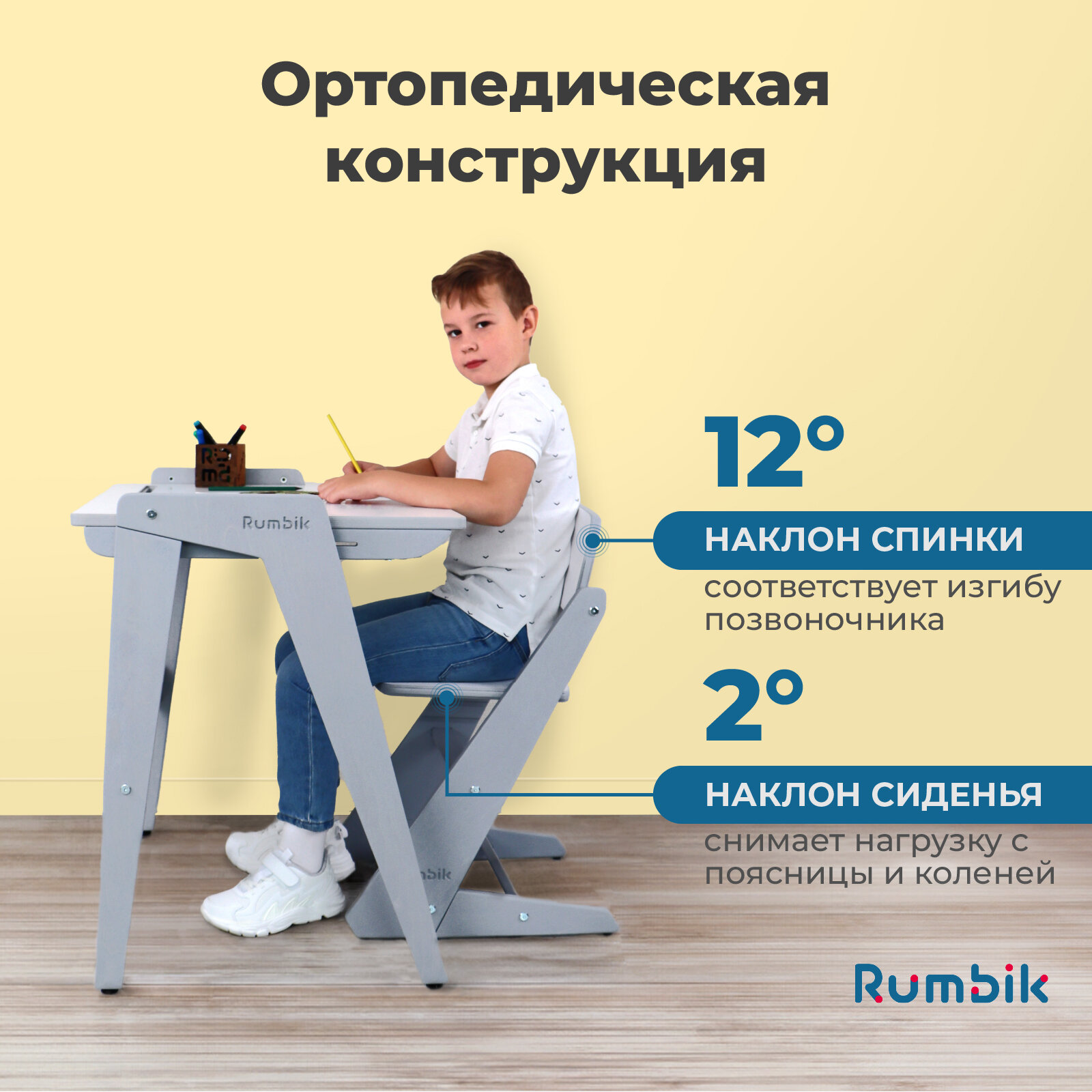 Анатомическая форма стула Rumbik Smart разработана с учётом требований ГОСТ и соответствует им по всем параметрам. Наклон спинки в 12 градусов удобен для опоры и помогает формированию правильной осанки. Небольшой уклон сиденья в 2,5 градуса также способствует тому, чтобы школьник сидел комфортно во время выполнения домашних заданий и занятий творчеством. Эргономичная ортопедическая конструкция помогает ребенку сохранить здоровье и сформировать полезные привычки.