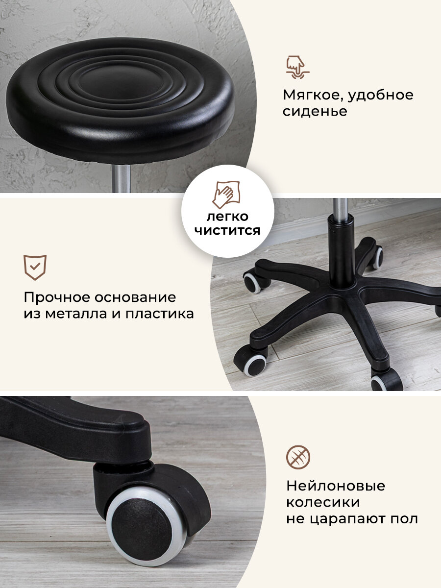 Маленький компактный крутящийся табурет на колесах имеет регулировку высоты и удобное круглое сиденье. Он на 100% мобилен, вращается на 360о и позволяет мастеру маневрировать в любом направлении и с легкостью перемещаться между креслом клиента и косметологическим столиком. Регулируемый по высоте стул для работы идеально подойдет для бьюти мастера маникюра и педикюра, парикмахера и барбера, косметолога и визажиста, бровиста и лешмейкера (мастеров бровей и наращивания ресниц), а также массажиста. Даже швея оценит его по достоинству! И это еще не все: наши стулья настолько многофункциональны, что могут использоваться и как мебель для дома и офиса, и как дачная мебель. Вы можете разместить их в любой комнате: кухне, гостиной, столовой, спальне, кабинете, на балконе. Это отличные кухонные, полубарные и интерьерные стульчики для туалетного и макияжного столика. И конечно, они подойдут в качестве офисных кресел для ПК, табуреток для письменного и рабочего стола, детских и школьных стульчиков для школьников, для девочек и мальчиков, а также в качестве компьютерной и геймерской мебели.