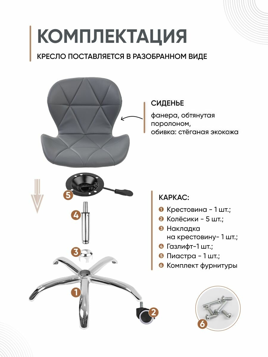Изготовленное из фанеры ортопедическое сиденье, обитое мягким поролоном и экокожей, придает мини креслу элегантный и стильный вид. Высококачественные материалы обеспечивают долговечность и удобство при длительной работе. Низкая спинка и вогнутое сиденье стула ракушки специально разработаны для обеспечения комфортной работы. Они позволяют сохранить правильную осанку и снижают нагрузку на спину. Больше не придется беспокоиться о боли в спине после долгих часов работы. Кроме того, мягкий стул для ПК имеет регулируемую высоту сиденья, что позволяет настроить его идеально под себя, с учетом своих индивидуальных предпочтений. Функция вращения на 360 градусов позволяет легко и быстро перемещаться по рабочему пространству. Оно создано специально для тех, кто проводит много времени за компьютером, может использоваться как компьютерное кресло геймерское и компьютерное кресло для ребенка. Никаких неудобств и ограничений движения - вы всегда будете на нужном месте в нужное время. Крестовина каркаса изготовлена из металла, а не из пластика, как у большинства аналогов, представленных на рынке. Металлический каркас кресла для компьютера гарантирует прочность и безопасность. Вы можете быть уверены, что оно выдержит вес до 120 кг и прослужит вам долгие годы. А специальные нейлоновые колесики не только обеспечивают свободное передвижение, но и защищают пол от царапин и повреждений.