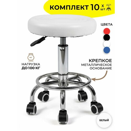 Встречайте те самые стулья мастера! Представляем вам набор мягких стульев на колесиках без спинки 10 шт. Gemlux GL-BR-002. Это универсальная мебель для косметологического и массажного кабинета, парикмахерской, тату студии и салона красоты. Маленькие компактные крутящиеся табуреты на колесах имеют регулировку высоты и удобное круглое сиденье. Они на 100% мобильны и позволяют мастерам маневрировать в любом направлении и с легкостью перемещаться между креслом клиента и косметологическим столиком. Комплект стульев 10 шт. идеально подойдет для мастеров маникюра и педикюра, парикмахеров и барберов, косметологов, бровистов и визажистов, лешмейкеров (мастеров по наращиванию ресниц) и массажистов. Даже швеи оценят их по достоинству! И это еще не все: наши стулья настолько многофункциональны, что могут использоваться как мебель для дома и офиса, дачная мебель. Вы можете разместить их в любой комнате: кухне, гостиной, столовой, спальне, кабинете, на балконе. Это отличные кухонные, полубарные и интерьерные стулья для туалетного и макияжного столика. И конечно, они подойдут в качестве офисных кресел для ПК, стульев для письменного и рабочего стола, детских стульчиков для школьников, для девочек и мальчиков, а также в качестве компьютерной и геймерской мебели. Сиденье выполнено из фанеры, обтянутой толстым слоем качественного плотного мебельного поролона. Обивка – устойчивая к истиранию экокожа. Крестовина кресла с кольцевой подножкой изготовлена из металла, в отличие от большинства аналогов на рынке, укомплектованных пластиковым каркасом. Это обеспечивает прочность и безопасность. Вы можете быть уверены, что металлические стулья подойдут и для детей, и для взрослых. Один стул выдерживает нагрузку до 100 кг. Усиленный газлифт регулирует высоту сиденья в пределах от 45 до 58 см. Пять нейлоновых колес обеспечивают плавный ход по любой поверхности, не заедают и не царапают напольное покрытие. Стулья поставляются в разобранном виде, с простой и понятной инструкцией по сборке. Наслаждайтесь уютом и комфортом с высокими стульями, которые сочетают в себе стиль, эргономику и надежность!