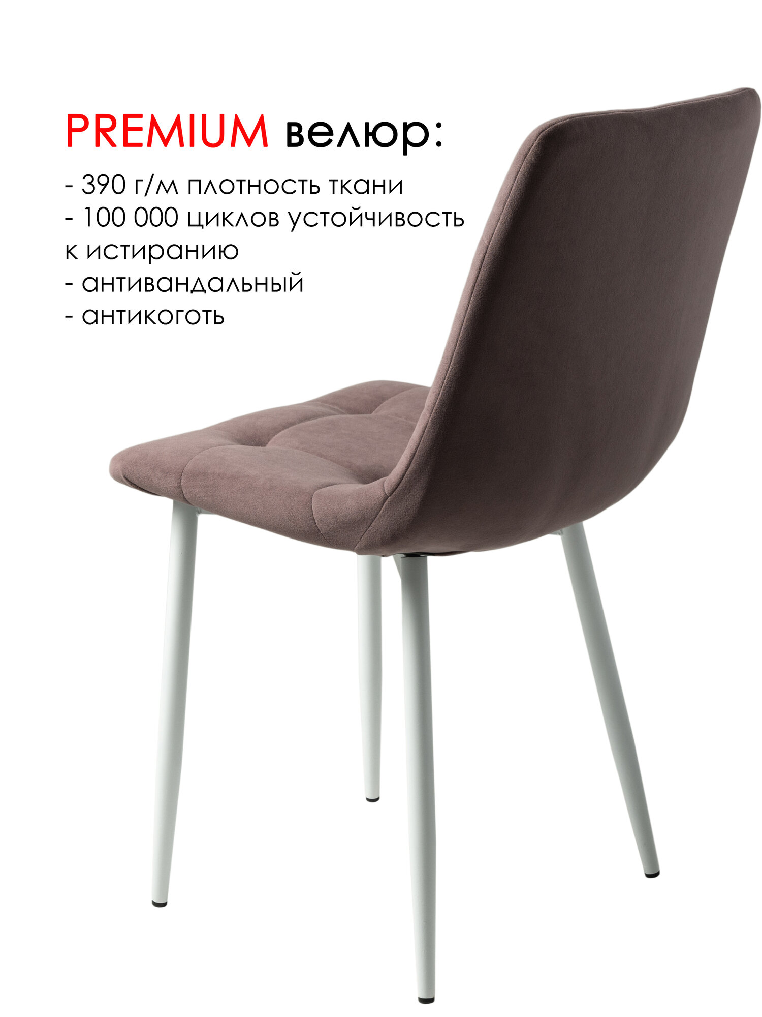 Сиденье и спинка стульев обиты мягким велюром, который приятен на ощупь и легко чистится. Материал обивки - искусственный велюр, который обладает высокой износостойкостью и долговечностью.