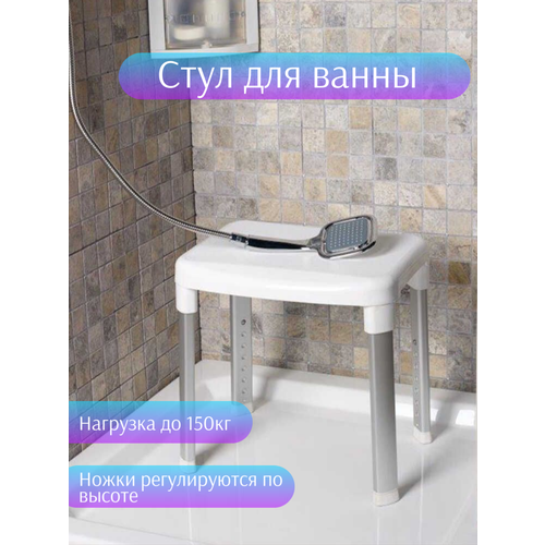 Стул для ванной. Размер сиденья 34*42 см. Ножки регулируются по высоте (42,5-52,5 см). Устойчиво стоит на полу благодаря нескользким ножкам с мягкой подошвой. Можно устанавливать в душевой кабине и ванне. Материал позволяет использовать его во время водных процедур. Материал: алюминий и пластик. Цвет: белый. Максимальная нагрузка: до 150 кг. Все товары этой группы протестированы международным концерном TUV Rheinland (Германия). Сиденье для ванны может использоваться как стул в ванную для пожилых или табурет для ванной для беременных. Подойдет для взрослых, чье здоровье не позволяет мыться без опоры, а также может служить в качестве стульчика для купания для детей, умеющих сидеть. Стул для купания - это удобный и практичный аксессуар для принятия водных процедур! Также стул можно использовать как подставка для хранения принадлежностей и аксессуаров для душа, хранения полотенец, детских игрушек для купания.