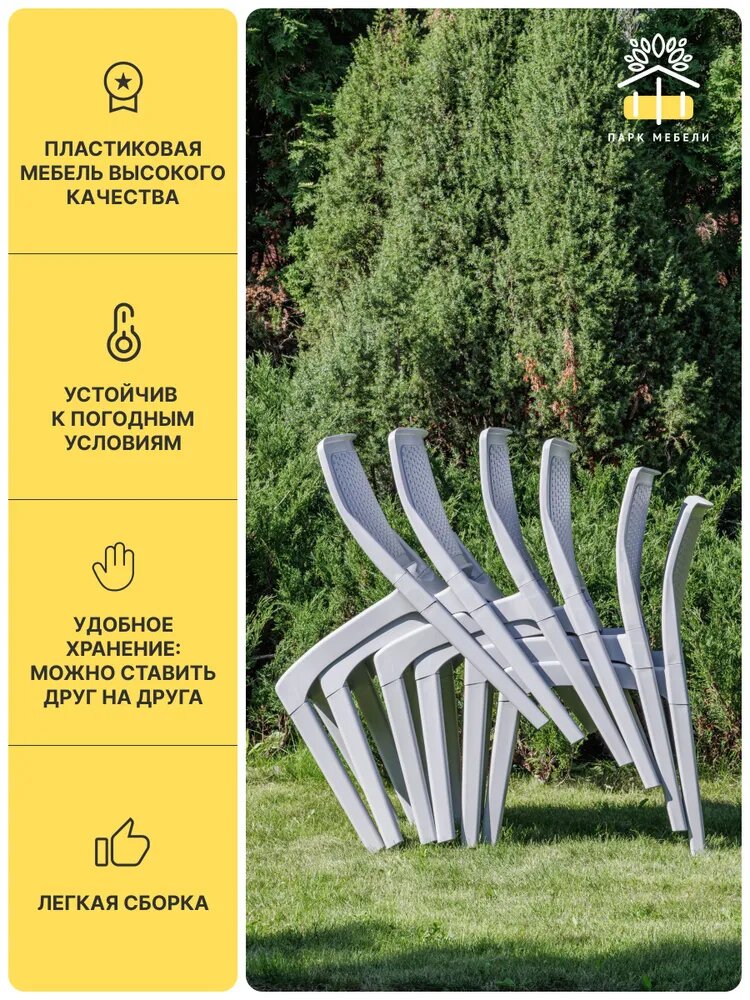 Комплект изготовлен из окрашенного в массе полипропилена с повышенной прочностью, что обеспечивает его долговечность и устойчивость к различным погодным условиям. Цвет комплекта - светло-серый, что позволяет ему гармонично вписаться в любой ландшафтный дизайн.