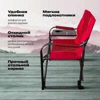 Кресло туристическое выполнено из прочных материалов, которые обеспечивают надежность и долговечность в различных погодных условиях. Оно оснащено встроенным столиком, что делает его многофункциональным – на столике можно разместить не только напитки и закуски, но и необходимые мелочи для рыбалки или другие аксессуары.