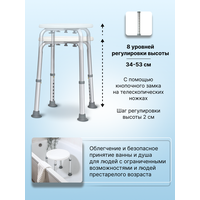 Прямоугольное сиденье размером 31х51 см изготовлено из прочного ABS пластика. Оснащено боковыми ручками и выемками для душевой лейки с обеих сторон и отверстиями для стока воды по периметру.Телескопические ножки изготовлены из анодированного алюминия, не подверженного коррозии. Оснащены насадками из термопластичной резины, препятствующей скольжению и обеспечивающей устойчивость.Стул имеет 7 уровней регулировки высоты: от 40 до 55 см. Легко собирается и разбирается. Лёгкий - всего 1,7 кг. При этом выдерживает нагрузку до 130 кг!