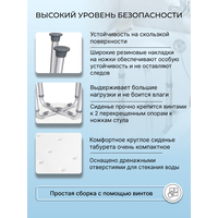 • Ширина: 32 см. • Глубина: 32 см. • Высота максимальная: 51 см. • Высота минимальная: 36 см. • Количество уровней регулировки высоты: 7. • Форма сиденья: круглая. • Тип товара: Стул-сиденье для купания. • Максимальная нагрузка: 130 кг. • Цвет сиденья: светло-серый. • Вес: 1.4 кг. • Артикул производителя: 532619.