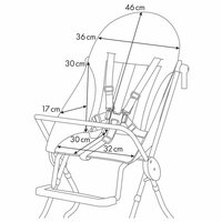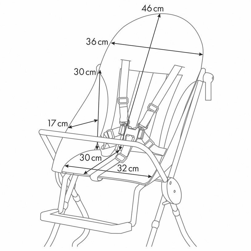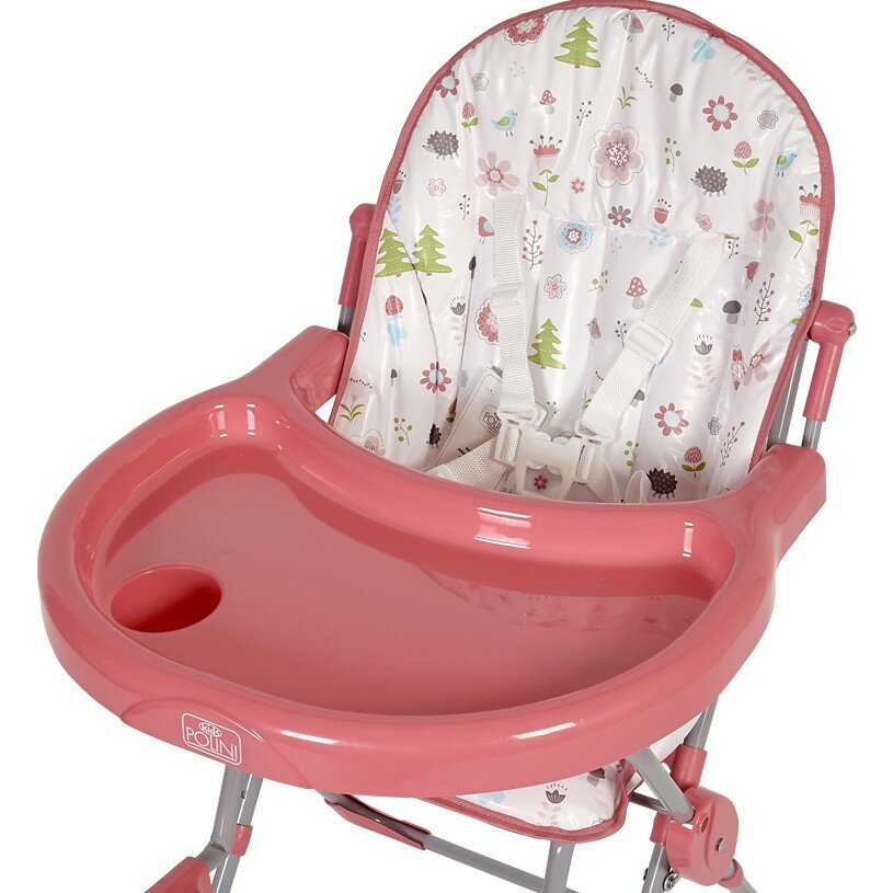 регулируемые ремни безопасности; несъемный складной столик с углублениями для посуды; устойчивая конструкция; высота от пола до подножки 47 см; высота от пола до столика 76 см