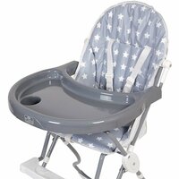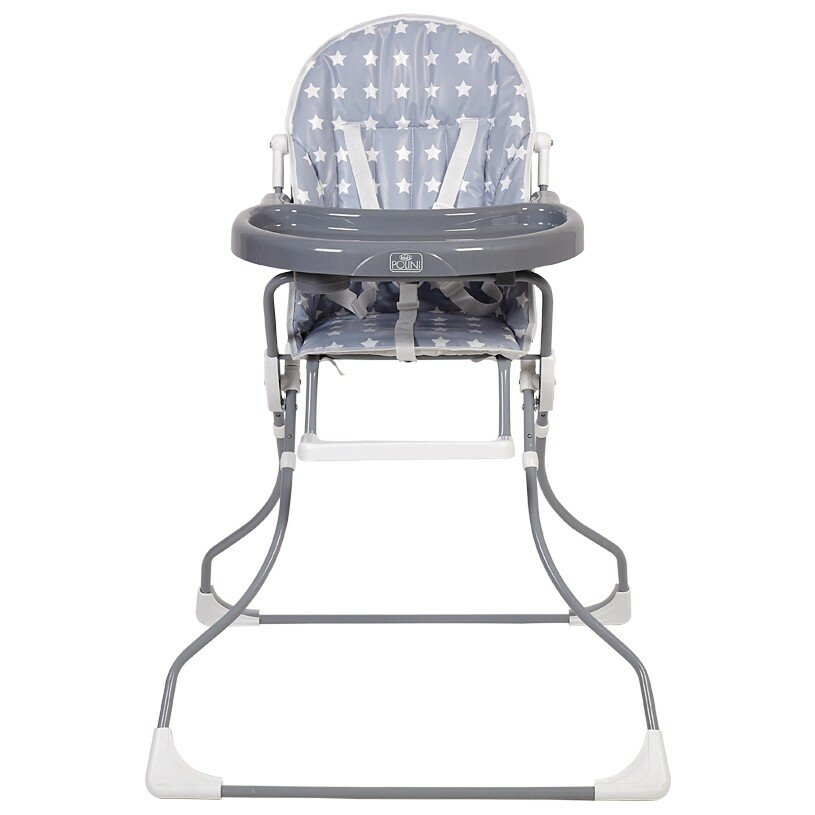 регулируемые ремни безопасности; несъемный складной столик с углублениями для посуды; устойчивая конструкция; высота от пола до подножки 47 см; высота от пола до столика 76 см