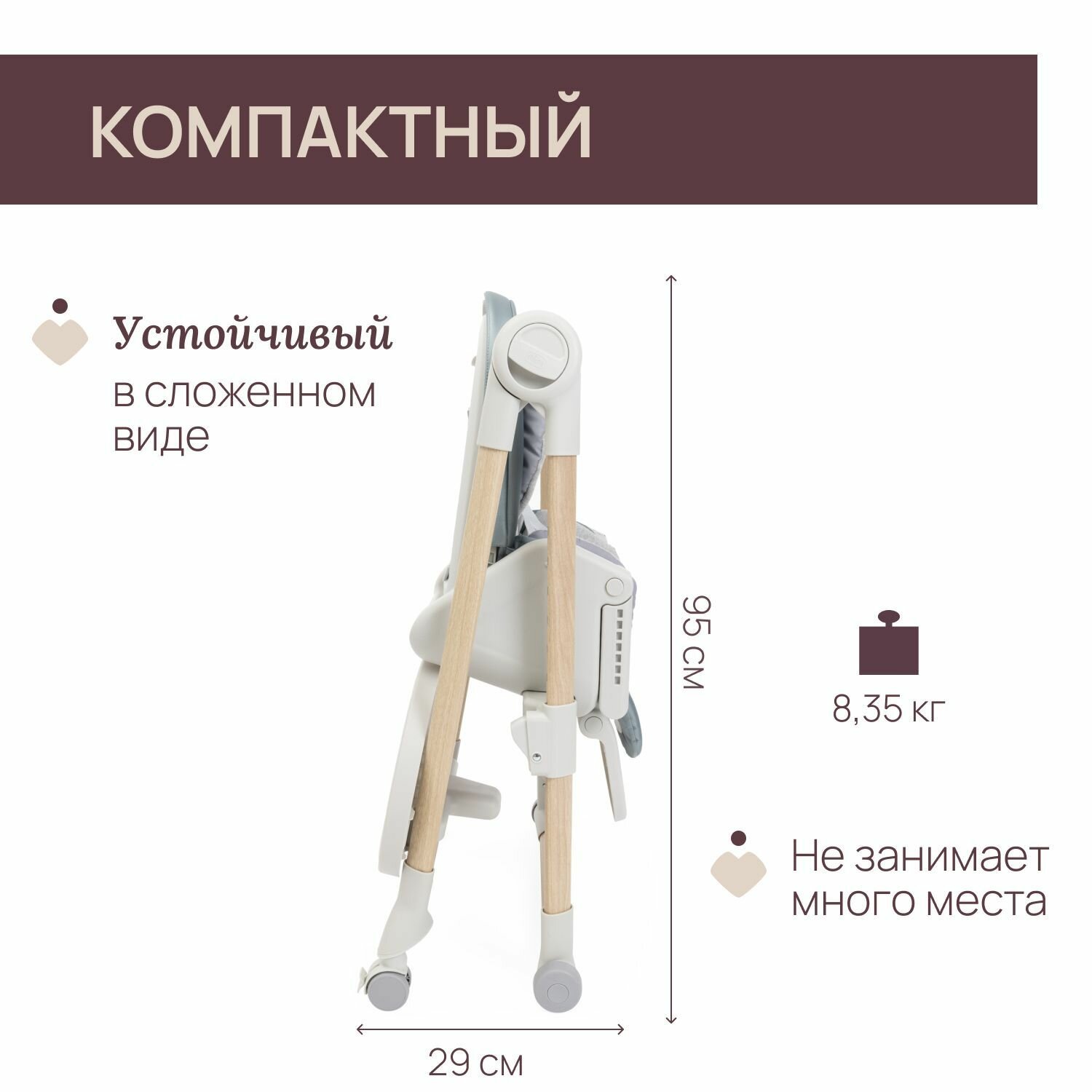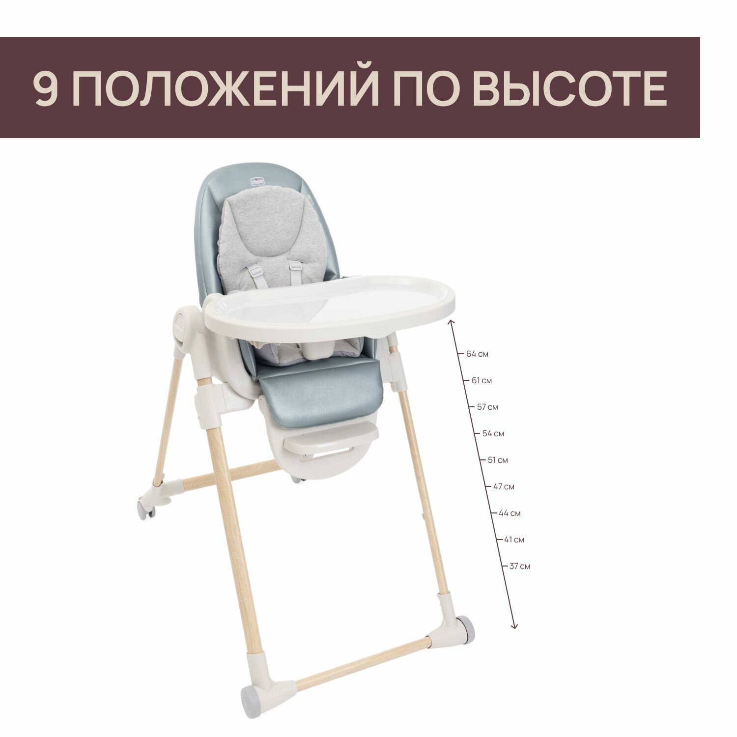 Особенности: Эргономичный вкладыш из 100% органического хлопка, поддерживает правильное положение малыша Мягкий чехол из премиального нежного экоматериала Маневренный, легко перемещать благодаря 4 колесам 3 положения наклона спинки 9 положений регулировки по высоте, подходит к большинству моделей столов Компактный в сложенном виде, стоит без опоры Идеален для маленькой кухни У столика с большим съемным подносом 4 положения Когда столик не используется, он крепится на задних ножках Регулируемый угол спинки и подножки, регулируемая высота ступеньки для ножек Пятиточечные регулируемые ремни для фиксации малыша