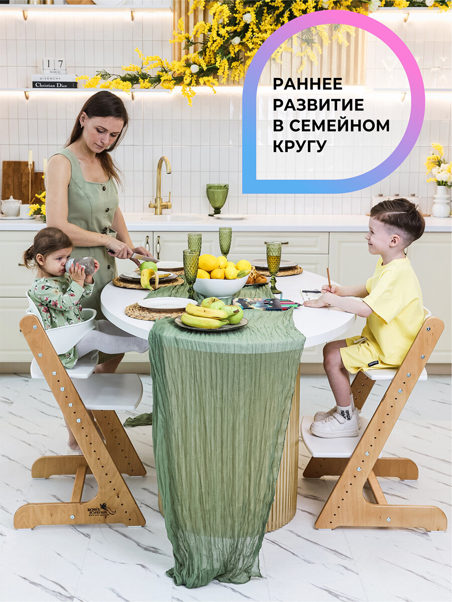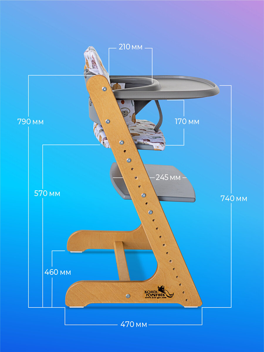 Стульчик для кормления подходит для малышей возрастом от 6 месяцев до 15 лет. Ключевым преимуществом детского стула Конек Горбунек является его многофункциональность. Растущий стул можно использовать как для кормления, так и для школьника, башню помощника. Имеет множество регулировок и может использоваться со стандартным кухонным столом. Таким образом, малыш может сидеть с родителями за одним столом. Удобные сиденье и подножка регулируется по глубине и высоте, что обеспечивает равномерное распределение нагрузки на спину малыша и способствует формированию правильной осанки, концентрации внимания и безопасности детей с малых лет. Изготовлен из экологически безопасных материалов, оснащен аксессуарами такими как ограничитель с ремнем безопасности для надежной фиксации малыша, удобный столик с бортиком, который регулируется в трех положениях. Конструкция стула продумана со всех сторон, при производстве используется инновационная технология KG-Fix. Мы уделили особое внимание ширине основания стула. Широкое основание 50 см делает его устойчивым, а специальные тефлоновые накладки помогут ребенку самостоятельно отодвигаться от стола, так и придвигаться к нему, без риска опрокидывания. Отлично подойдет и для мальчиков, и для девочек, его можно разместить в любой комнате, особенно на кухне или деткой комнате. Стульчик-трансформер для кормления способен стать отличным подарком на День Рождения или другой праздник.
