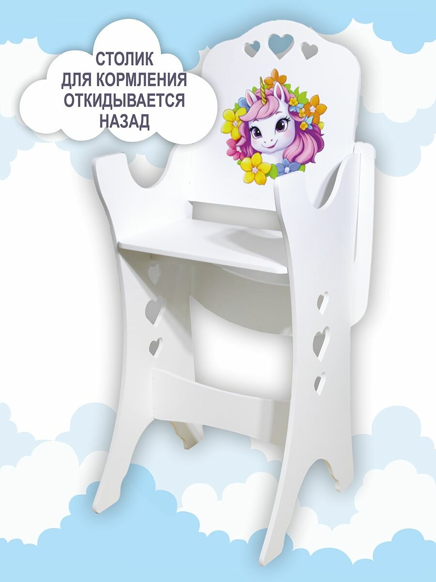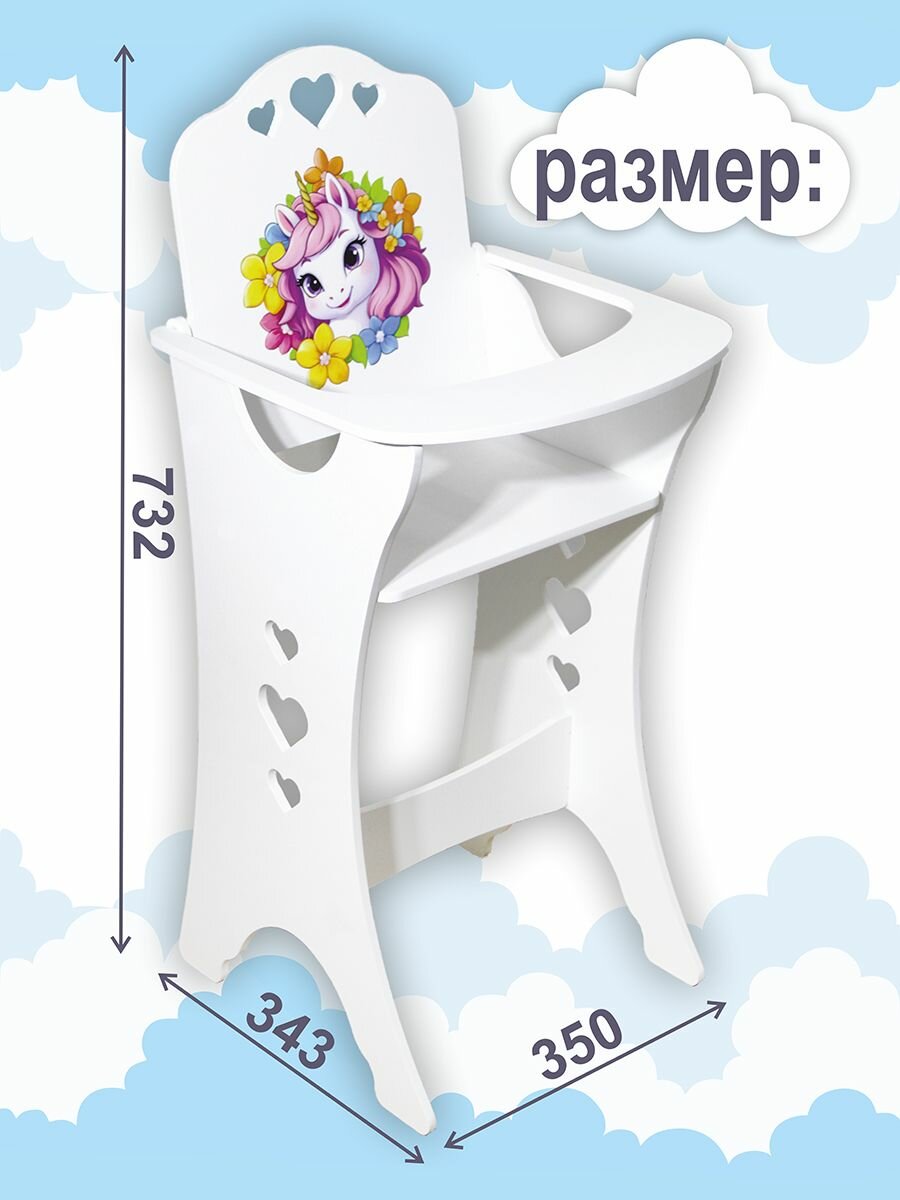 Кукольный стул прочный, надежный, безопасный и красивый. Размеры стула: 35 х 34,3 х 73,2 см. Подходит для кукол ростом от 30 до 60 см (пупсов, беби борн, реборн, барби, кукол младенцев и других). Кукольный стульчик для кормления изготовлен из натуральной древесины - МДФ толщиной 8 мм. Все детали тщательно отшлифованы, покрыты безопасной краской, углы скруглены. Наша игрушка для девочек полностью безопасна для здоровья! Стул для куклы имеет столик, за которым удобно кормить или играть с куклой. Используя нашу кукольную мебель, игра станет более насыщенной, яркой и веселой, открывая детям бесконечные возможности для творчества. Это поможет развить у малышки фантазию, аккуратность, а также познакомит с понятиями ответственности и заботы, что особенно важно на раннем этапе развития. Стульчик для кормления продаётся в разобранном виде, легко собирается прочными саморезами из комплекта. Деревянный стульчик для кормления кукол идеальный вариант подарка для девочки на день рождения, 8 марта, новый год и другие праздники.