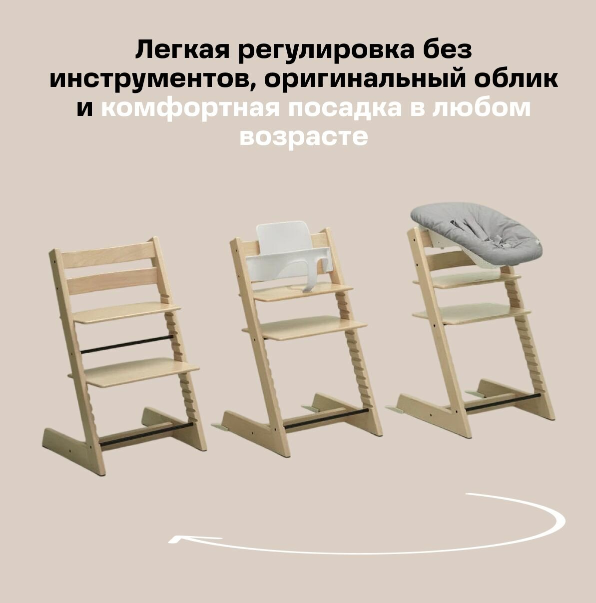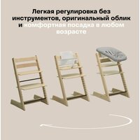 | Дополнительная информация | тип древесины: бук; аксессуары в базовый комплект не входят; дополнительно можно приобрести кресло-шезлонг для новорожденных Tripp Trapp Newborn Set, фиксатор Tripp Trapp Baby Set, мягкие чехлы, съемный столик Stokke Tray |
