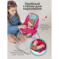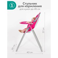 Прекрасный стульчик – трансформер для кукол! 3 в 1: стульчик для кормления куклы, качели и переноска для пупса. С ним игра в дочки-матери станет реалистичнее и гораздо интереснее! Схема трансформации очень простая, справится даже ребенок. Превратить стул для кормления в качели, а затем и в переноску можно буквально за секунды! Подойдет для кукол высотой до 45 см. Удобный крючок для подвешивания люльки – качели. Стильный дизайнерский принт. Складной металлический каркас и съёмное текстильное сиденье на клёпках. Трёхточечный ремень безопасности защитит куклу от падения. Размер стульчик для кормления куклы: 57х40х30см.