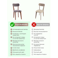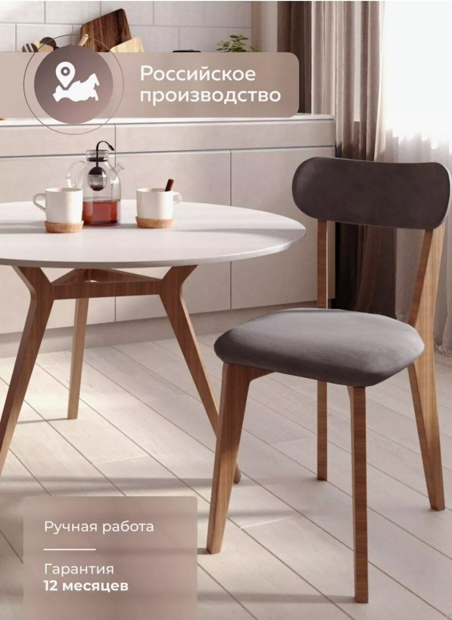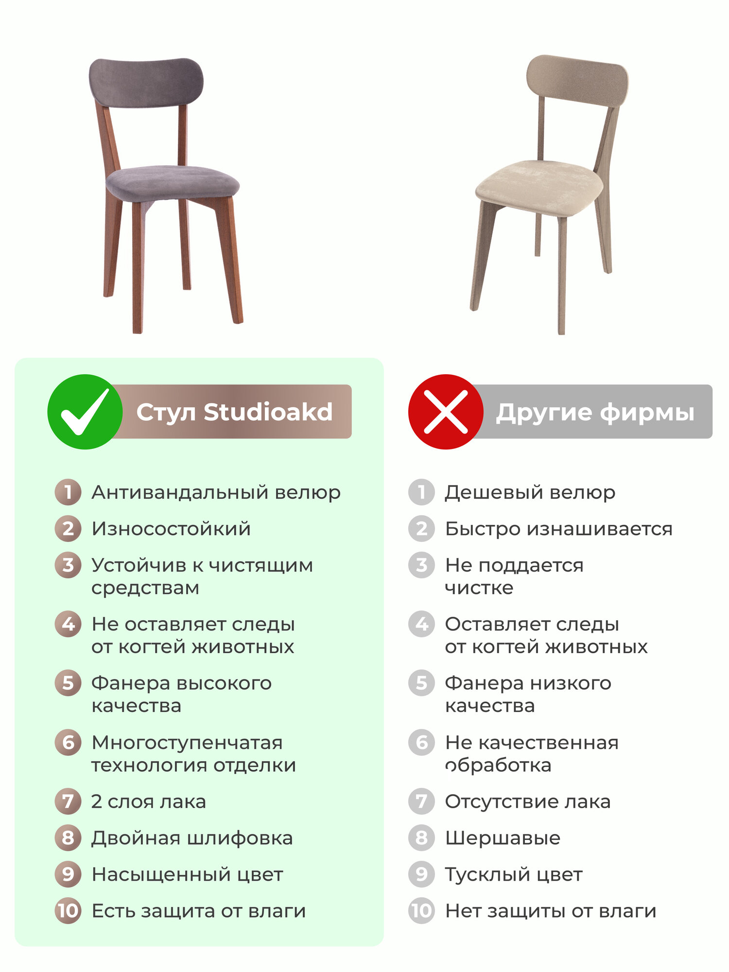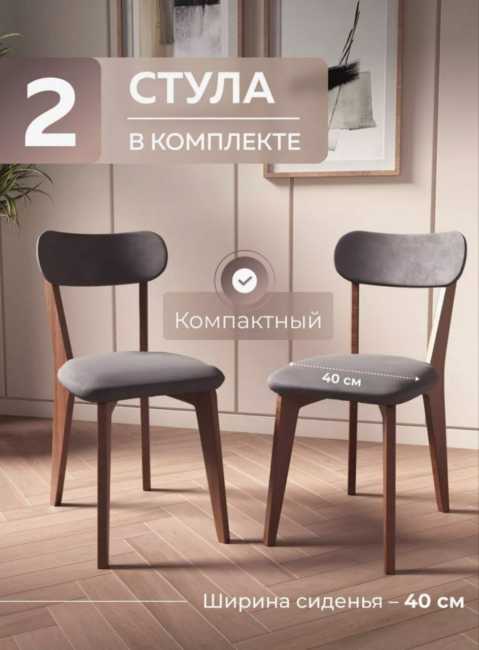 Мягкие стулья со спинкой в наборе из двух штук - практичное приобретение от бренда Studioakd! Легкий, но прочный стул на четырех устойчивых ножках дополнен ортопедической спинкой. Мебельное изделие выдерживает нагрузку до 120 кг, обеспечивает здоровое и комфортное положение сидя с правильной нагрузкой на тазобедренные суставы и позвоночник, поддерживает красивую осанку. Компактную модель отличает каркас - основание из натуральной фанеры (береза толщиной 10 мм), наполнитель в виде поролона (ППУ, толщиной 20 мм), который надежно сохраняет форму изделия мягкой и приятно выпуклой и не теряет ее даже в условиях интенсивной эксплуатации. Ножки из березы покрыты лаком, что защищает их от царапин и других повреждений. Ширина сидушки стульчика - 40 см, что удобно при небольших размерах стола в небольшой по площади кухне. Внешняя обивка сиденья и спинки - фабричный микровелюр серого цвета. Это приятный на ощупь материал с бархатной текстурой, с высокой износостойкостью (выдерживает до 60000 циклов использования), с антивандальными свойствами и с эффектом антикоготь, благодаря которым изделие не боится когтей домашних животных. Эффект аквастоп, которым также обладает ткань, препятствует впитыванию влаги. Прочный велюровый материал не выцветает и не впитывает грязь, устойчив к истиранию. Эстетичный деревянный стульчик в лаконичном дизайне элегантно впишется в помещение кухни или столовой, гостиной или зала, спальни или детской комнаты, офиса, студии или салона красоты, ресторана или кафе в любом стиле: современный, лофт, классика, скандинавский или прованс. Комплект из двух стульев будет удобен в виде офисной мебели, дополнит обеденную кухонную зону в доме или квартире, дачном домике, а также рабочее место школьника или студента, подойдет и для детей, и для взрослых. Разместите универсальную модель в прихожей или коридоре, на балконе или лоджии, в рабочем кабинете или комнате отдыха - стильный интерьерный предмет подарит пространству домашний уют и эстетику. Сборка качественной и эргономичной мебельной продукции российского производства (с полным циклом технологического процесса в городе Москве) обычно не вызывает никаких сложностей. Срок службы изделия - 10 лет. В линейке бренда представлены модели мебели разных цветов из различных материалов, чтобы вы могли выбрать идеально подходящий к вашему интерьеру вариант. У нас есть акции и распродажи, вы можете купить наши товары в подарок со скидкой!