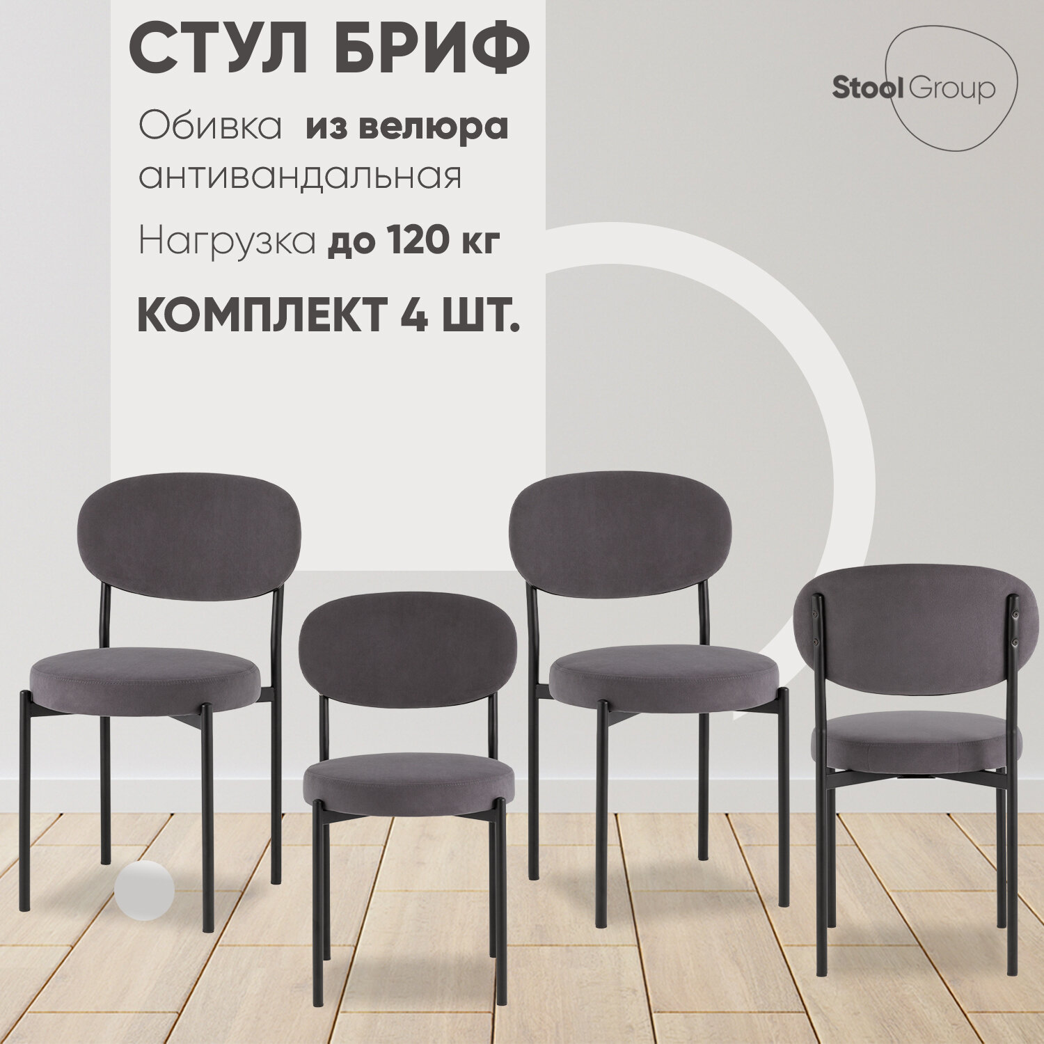 Комплект из набора четырех стульев. Комплект из удобных стульев — отличное решение для приёма гостей. Обеденный стул серый Бриф для кухни подходит для современных и смешанных интерьеров и отлично смотрится в комплекте. Мягкое круглое сиденье и эргономичная спинка способствуют комфортному положению за столом.
