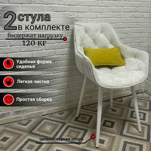 Стулья для кухни Честер 2 шт, антивандальный велюр с краш эффектом в белом цвете (Plush white onyx), опоры белые. Удобные стулья подойдут к любому стилю вашего интерьера (классический, скандинавскому, лофт, минимализм и т. п.). Стул кухонный со спинкой обладает высокими показателями эргономики и комфорта. Предусмотрено широкое сиденье и достаточно высокая спинка, на которую удобно опираться. Ширина стула 55 см, высота стула 87 см, высота от пола до сиденья 50 см. Удобный стул со спинкой и мягкой сидушкой - универсальный вариант для любых помещений. Всё благодаря элегантному стилю и повышенному удобству. Мягкое сидение отлично подходит как для короткого, так и для длительного сиденья. А обивка гармонично сочетается с плавными изгибами спинки и сиденья. Особенностью дизайна является декоративная имитация каретной стяжки, которая смотрится очень эффектно. Кухонный стул имеет прочные и надежные ножки с пластиковыми заглушками, выдерживающие нагрузку до 120 кг. Велюровая ткань плотностью 350 г/м2 имеет устойчивость к истиранию 100 000 циклов по тесту Мартиндейла. Обивка мягкая, износостойкая, легко чиститься. Каркас – березовая фанера, экологически чистый материал, который не выделяет вредных веществ даже на солнце. Фактический цвет может немного отличаться, в зависимости от цветопередачи экрана вашего устройства.