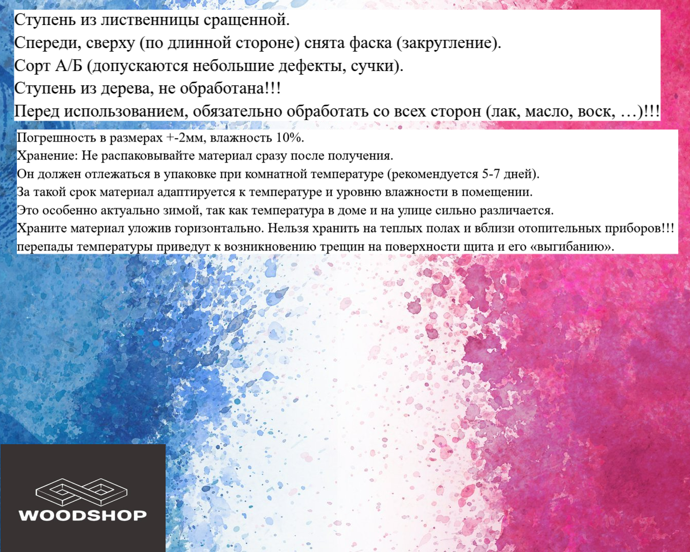 Ступень деревянная WOODSHOP 40х250х800 мм лиственница сращенная, сорт АВ: сравнение цен, характеристики, фото, актуальное наличие и цены.
