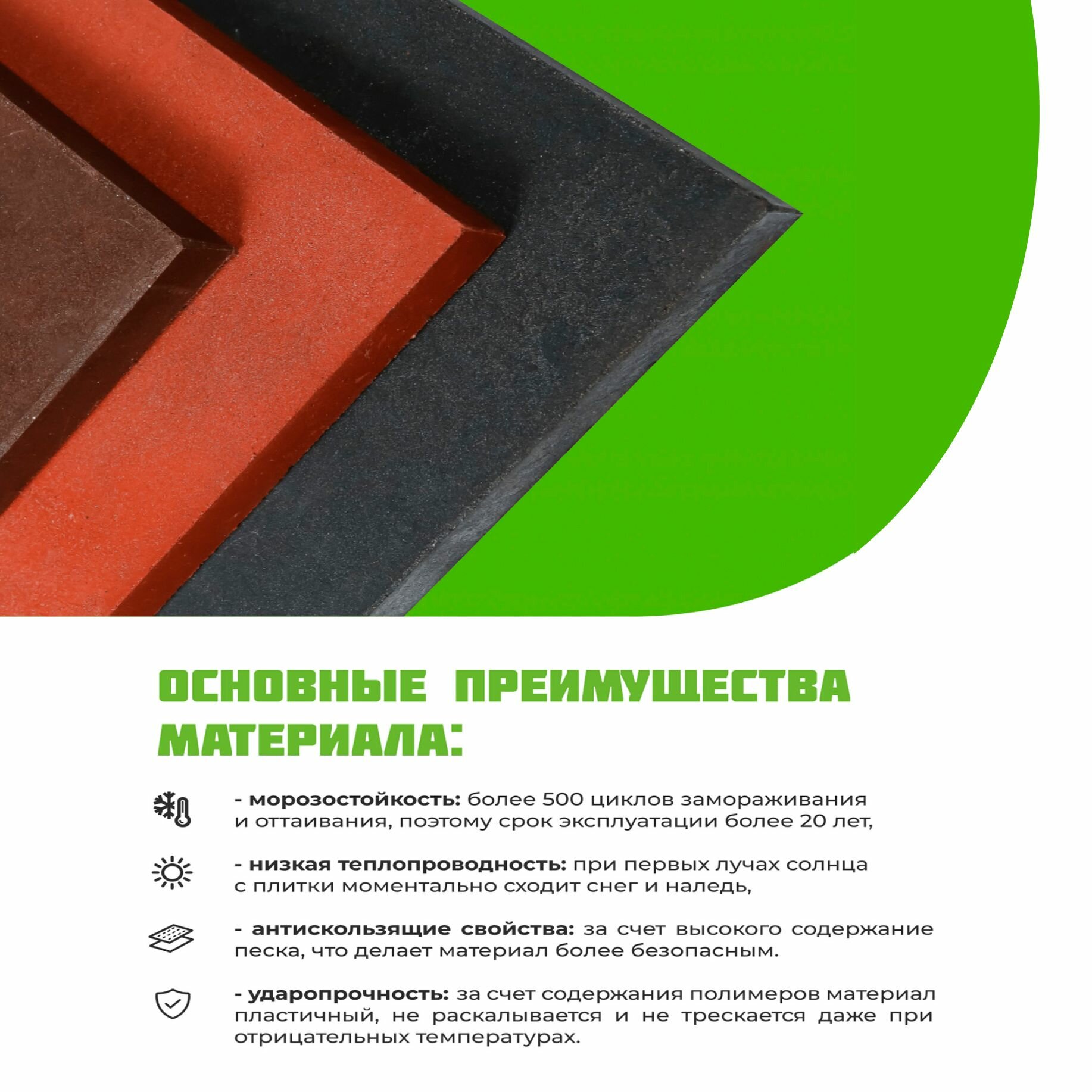 Разработанная нашей компанией форма ребер жесткости позволяет надежно закрепить плитку с помощью недорогих клеев на бетонном основании.
