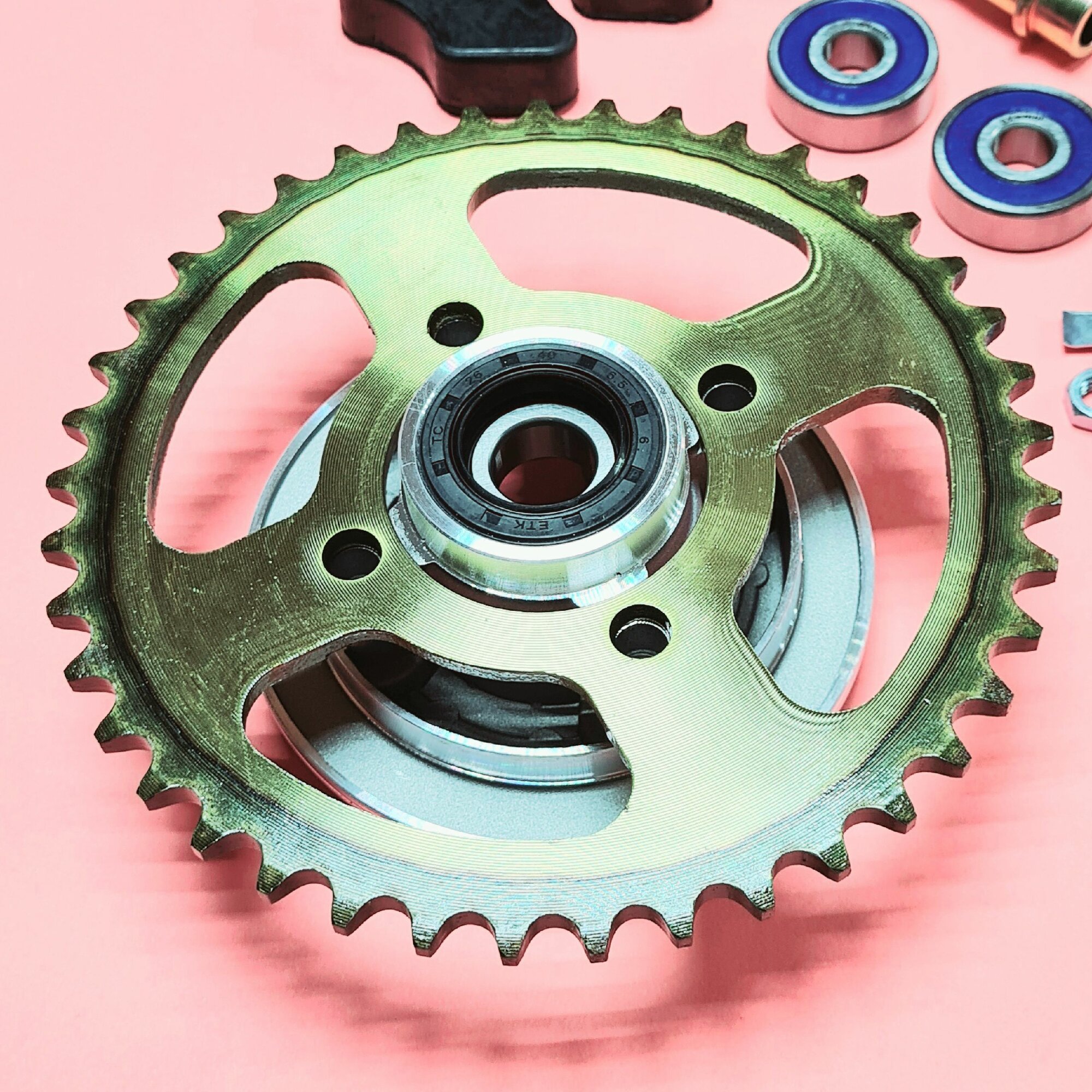Демпфер ступица колеса заднего для мопедов типа DELTA/ALPHA (муфта задней звезды, основание задней звезды). Устанавливается в заднее колесо и предназначена смягчать усилие передаваемое на ведомую звезду. Демпфер является универсальной запчастью, на него могут крепится звезды и под 420-ю цепь и под 428-ю, с разным количеством зубьев. Посадочный диаметр 17 мм. Подшипник 6203-RS. Диаметр отверстий крепления 7 мм. Расстояние между крепежными отверстиями по центрам 50 мм.