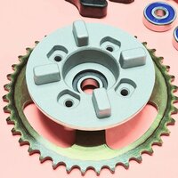 Демпфер ступица колеса заднего для мопедов типа DELTA/ALPHA (муфта задней звезды, основание задней звезды). Устанавливается в заднее колесо и предназначена смягчать усилие передаваемое на ведомую звезду. Демпфер является универсальной запчастью, на него могут крепится звезды и под 420-ю цепь и под 428-ю, с разным количеством зубьев. Посадочный диаметр 17 мм. Подшипник 6203-RS. Диаметр отверстий крепления 7 мм. Расстояние между крепежными отверстиями по центрам 50 мм.