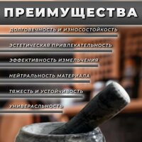 Ступка достаточно глубокая, что предотвращает просыпание ингредиентов на стол. Это особенно актуально при измельчении перца или соли, когда важно сохранить чистоту и порядок на рабочем месте.