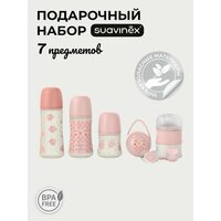 Купить Suavinex подарочный набор для новорожденного из 7 предметов: три бутылочки для кормления, соска-пустышка, зажим для пустышки, держатель для пустышки, контейнер для смеси с доставкой по всей России.