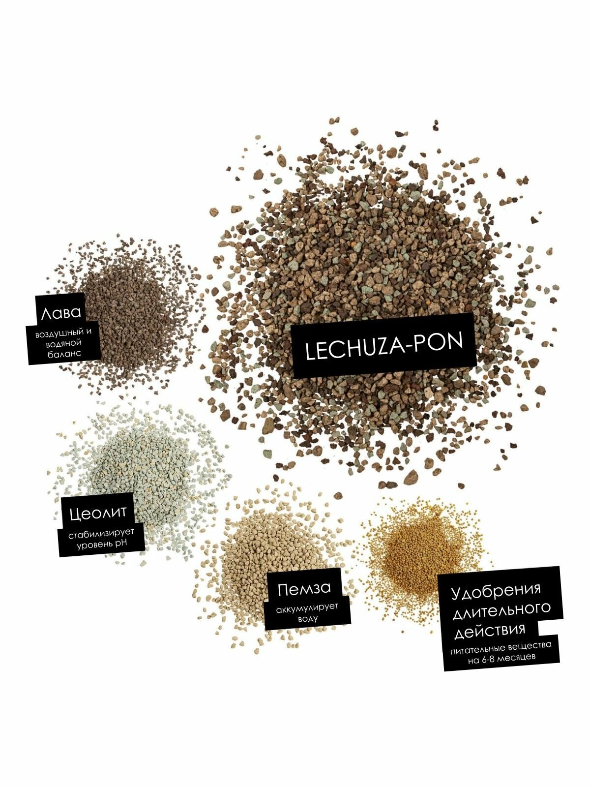 Субстрат Lechuza PON накапливает воду и питательные вещества и передает их растениям. Подходит для горшечных растений и орхидей. Держит форму и обеспечивает доступ кислорода к корням. Обладает хорошей дренажной способностью. Имеет стабильный уровень pH. Подавляет рост плесени и не является местом обитания вредителей. Общее описание Субстрат Lechuza PON – это минеральный субстрат профессионального уровня и отличная альтернатива обычным грунтам для растений. Его можно использовать в качестве дренажного слоя или полностью заменить им почву. Высококачественные минеральные камни не содержат вредных веществ и обеспечивают растение всеми необходимыми макро- и микроэлементами. До 6 месяцев можно не вносить дополнительных удобрений! В чем особенности субстрата Субстрат Lechuza PON обладает идеальной для растений проницаемостью. Это обеспечивает оптимальное соотношение воздуха и воды, позволяет равномерно накапливать влагу и предотвращает гниение корневой системы. Минеральный субстрат блокирует грибы, которые разрушают корни растений. Поэтому субстрат Lechuza PON подходит для людей, страдающих аллергией. Кроме того, в субстрате не размножаются вредители. Для каких растений подходит? Субстрат Lechuza PON является основой для роста и цветения большинства видов растений: лиственных, цветущих, кактусов, пряных трав и овощей, и даже для привередливых орхидей и цитрусовых. Что входит в состав? В состав субстрата Lechuza PON входит цеолит (поддерживает идеальный уровень pH), немецкая очищенная пемза, немецкая вулканическая порода (непрерывно снабжает ваше растение железом), удобрения высшего качества. Легкосыпучий субстрат Lechuza PON в виде гранул позволяет аккуратно сажать, пересаживать и поливать растение удобрения высшего качества Легкосыпучий субстрат Lechuza PON в виде гранул позволяет аккуратно сажать, пересаживать и поливать растение