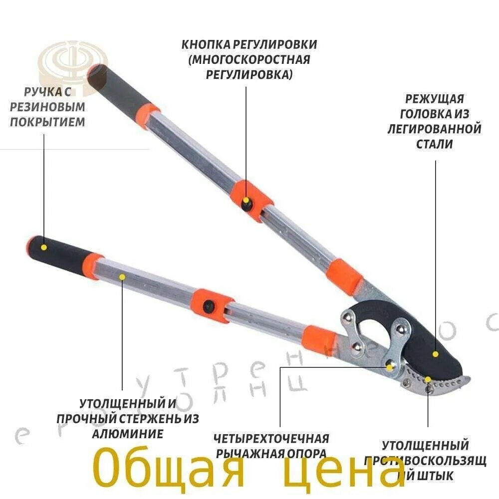 Сучкорезимееттелескопическиеручки, чтобыувеличитьрычагиуменьшитьусилиенаруки. Атакжедлятого, чтобыбылавозможностьобрезатьветкинеприбегаякиспользованиюлестницы. Имеет6фиксирующихточекдлярегулировкидлины.