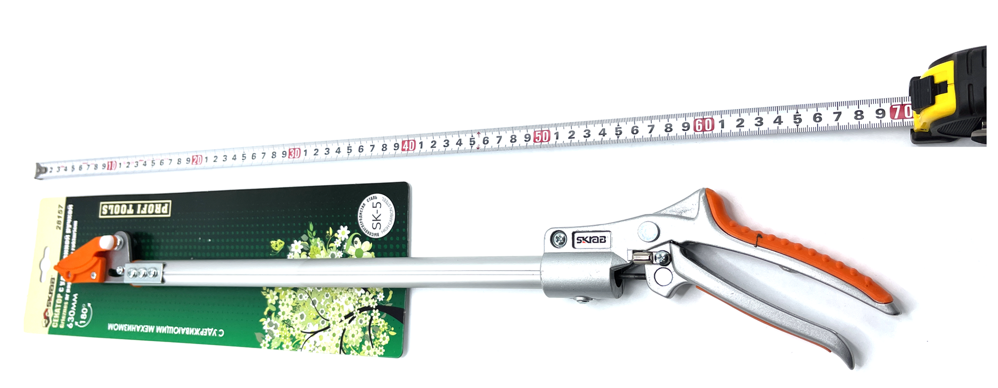 Секатор 630мм. поворотный на 180 гр. нож Японская сталь SK5 TEFLON Skrab 28157 Позволяет добраться внутри кроны кустарника без риска поцарапаться о колючки и жесткие ветки . Лезвия оснащены дополнительными пластиковыми губками для удержания срезанных цветков и плодов. Лезвия выполнены из японской стали SK5 , что позволяет сохранять долгую заточку при работе и покрыты тефлоновым покрытием TEFLON ( Придаёт дополнительную стойкость к загрязнению и коррозии ) Штанга длинной 630 мм. очень лёгкая алюминиевая , Имеет угол поворота 180 градусов.