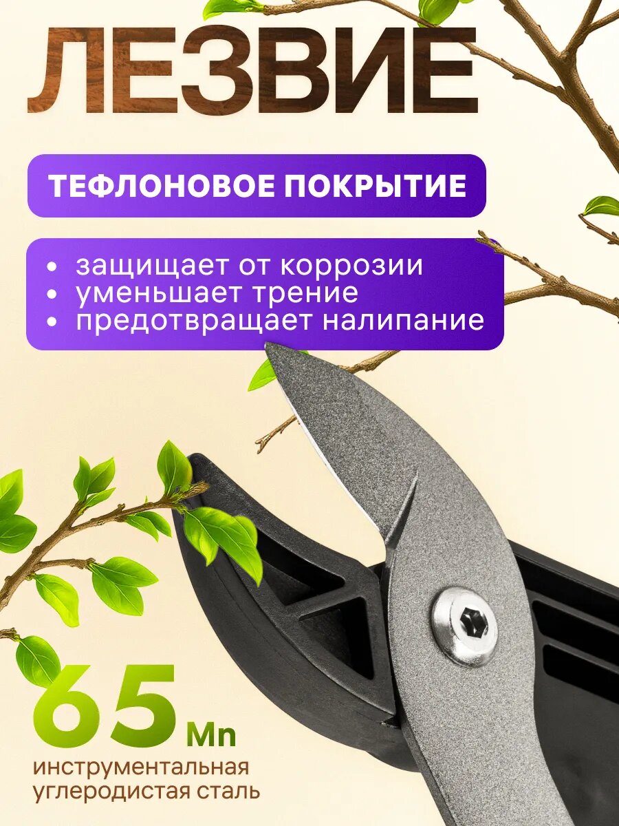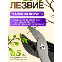 Прочные лезвия из инструментальной углеродистой стали 65Mn с тефлоновым покрытием обеспечивают долговечность и устойчивость к коррозии. Контактные лезвия загнутой формы гарантируют точное и аккуратное срезание веток, не повреждая кору дерева.
