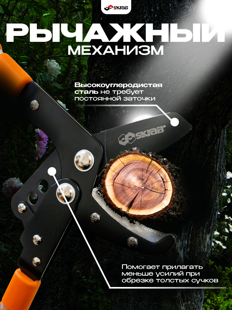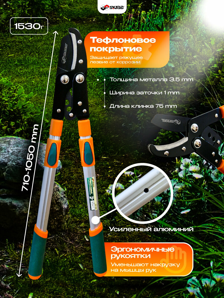 Телескопический контактный двух рычажный сучкорез SKRAB 28186 с трещоточным механизмом позволяет отрезать как сухие так и живые ветки диаметром до 50 мм, прилагая минимальные усилия на большой высоте. Прочные телескопические ручки выполнены из усиленного алюминиевого профиля, раздвигаются на 350 мм, увеличивая длину до 1020 см, позволяют дотянуться до самых высоких веток. Защищенное от коррозии острое, заточенное с двух сторон лезвие сучкореза изготовлено из японской стали SK-5 специально предназначено для быстрого аккуратного реза, не повреждающего кору, имеет тефлоновое покрытие.
