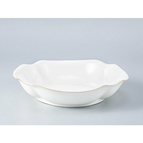 Особенностью сухарницы является рисунок "Золотая лента", который нанесен на белоснежную поверхность изделия. Изысканная отводка натуральным золотом подчеркивает хрупкость материала и изящную форму предмета.