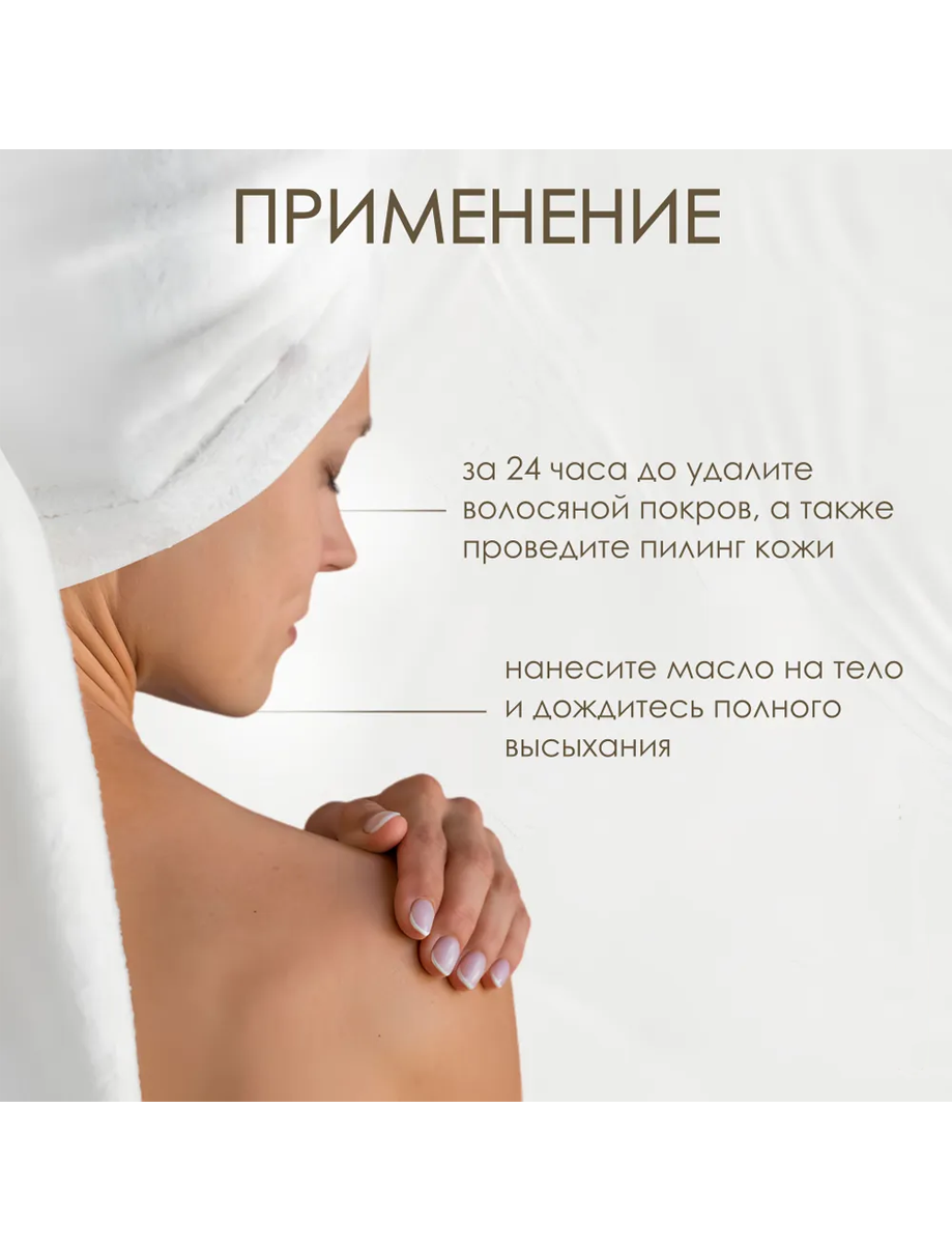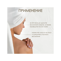 За 24 часа до использования сухого кокосового масла необходимо удалить с поверхности тела волосяной покров, а также провести пилинг кожи. Непосредственно перед нанесением увлажните сухие или шелушащиеся участки кожи на теле. Нанесите сухое масло на кожу. Следите за тем, чтобы масло распределялось по коже равномерным слоем и покрыло всё тело. После окончания процедуры подождите, пока масло полностью не впитается в кожу и не высохнет, затем надевайте одежду. Первые 6-8 часов после процедуры избегайте контакта с водой, по окончании этого времени можно принять душ.