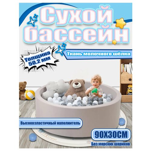 Сухой бассейн представляет собой каркасное изделие круглой формы, выполненное в светло-сером цвете. Размеры бассейна составляют 90x90х30 см, что делает его компактным и удобным для размещения в любом уголке вашего дома.