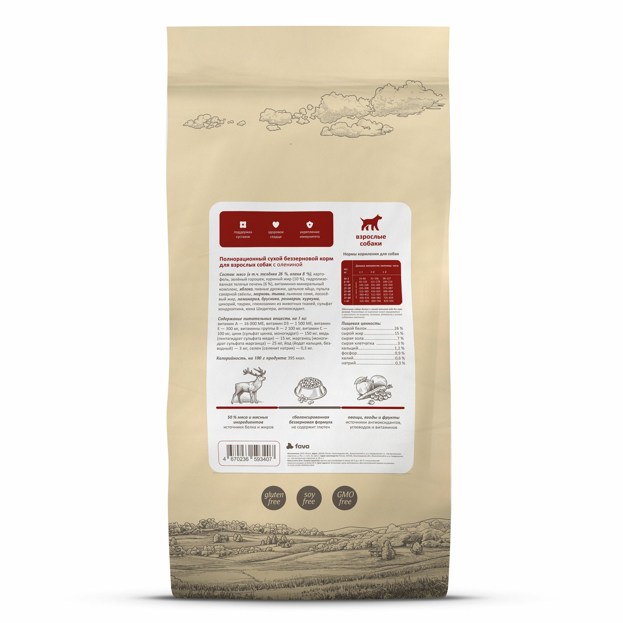 Состав: мясо (в т.ч. телёнка 26 %, оленя 8 %), картофель, зелёный горошек, куриный жир, витаминно-минеральный комплекс, яблоко, пивные дрожжи, цельное яйцо, пульпа сахарной свёклы, морковь, тыква, льняное семя, лососёвый жир, ламинария, брусника, розмарин, куркума, цикорий, таурин, глюкозамин из животных тканей, сульфат хондроитина, юкка Шидигера