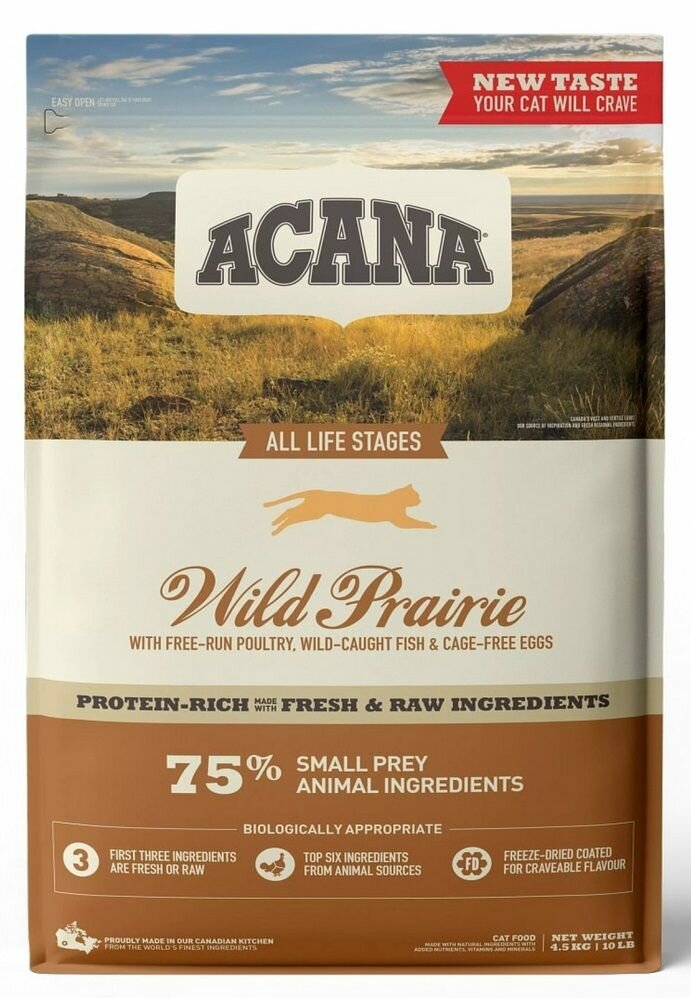 Acana Wild Prairie Cat – это премиальный беззерновой корм, созданный для обеспечения оптимального питания кошек всех пород и возрастов. Вдохновленный природой канадских прерий и чистейших озер, этот корм богат белками животного происхождения и соответствует природным потребностям вашей кошки.