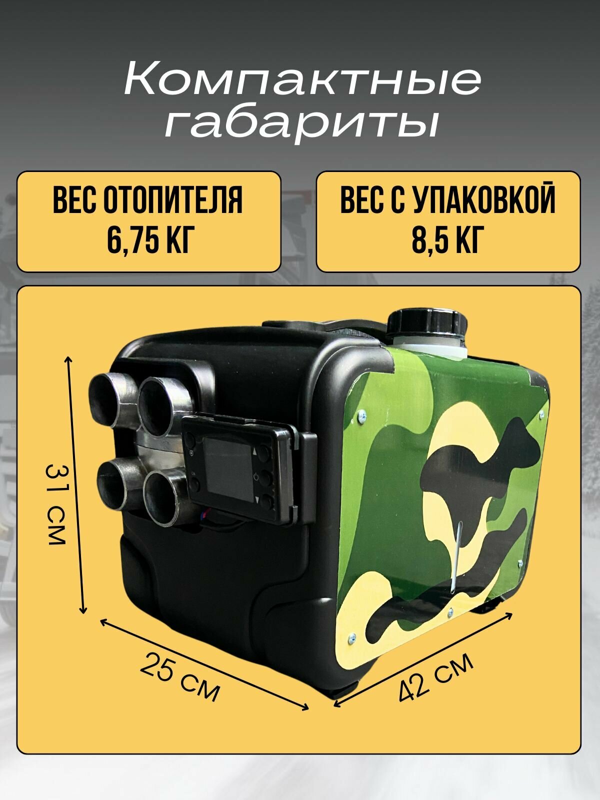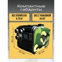 Гарантия 6 месяцев после получениябесплатная доставка✅Производитель «SMARTCRV»<втономный отопитель с мощностью 8 кВт — это незаменимое устройство для обогрева различных помещений и транспортных средств. С его помощью вы сможете быстро создать комфортные условия в гараже, бытовке, на складе или в спецтехнике. Также он отлично подходит для использования в автобусах и на зимней рыбалке.### Основные преимущества:- Высокая температура на выходе: до 210 градусов во ельсия, что обеспечивает эффективный обогрев пространства.- Большая мощность: способен обогреть объём до 250 кубометров воздуха всего за один час.- Климат-контроль: встроенная система управления климатом позволяет поддерживать нужную температуру в помещении.- Низкий уровень шума: работает тихо, не нарушая спокойствия окружающих.- Быстрое подключение: всего 5 минут — и устройство готово к работе.- Пульт дистанционного управления: удобство использования издалека.- Рекомендованное время беспрерывной работы: до 24 часов.### Комплектация:- 4 гофра с выходом теплого воздуха, длина 35-45 см, диаметр 4.5 см- Выхлопная труба длина 80см, диаметр 2.5см- Глушитель- Воздухозаборник длина 30-45см, диаметр 2.5 см- Хомуты- Пульт дистанционного управления- Провода для подключения к аккумулятору длиной 80см- Инструкция на русском языке- Ремкомплект### Технические характеристики:- Мощность: 8000Вт- Сопла: 4 сопло металл- Тип топлива: дизель- Напряжение: 12В / 24В / 220В- Расход топлива: 150-500 мл/ч- Номинальная потребляемая мощность: 15-90 Вт- Рабочая температура: от -40 °С до +40 °С.<тот автономный отопитель станет отличным помощником в холодное время года, обеспечивая тепло и комфорт в любых условиях.