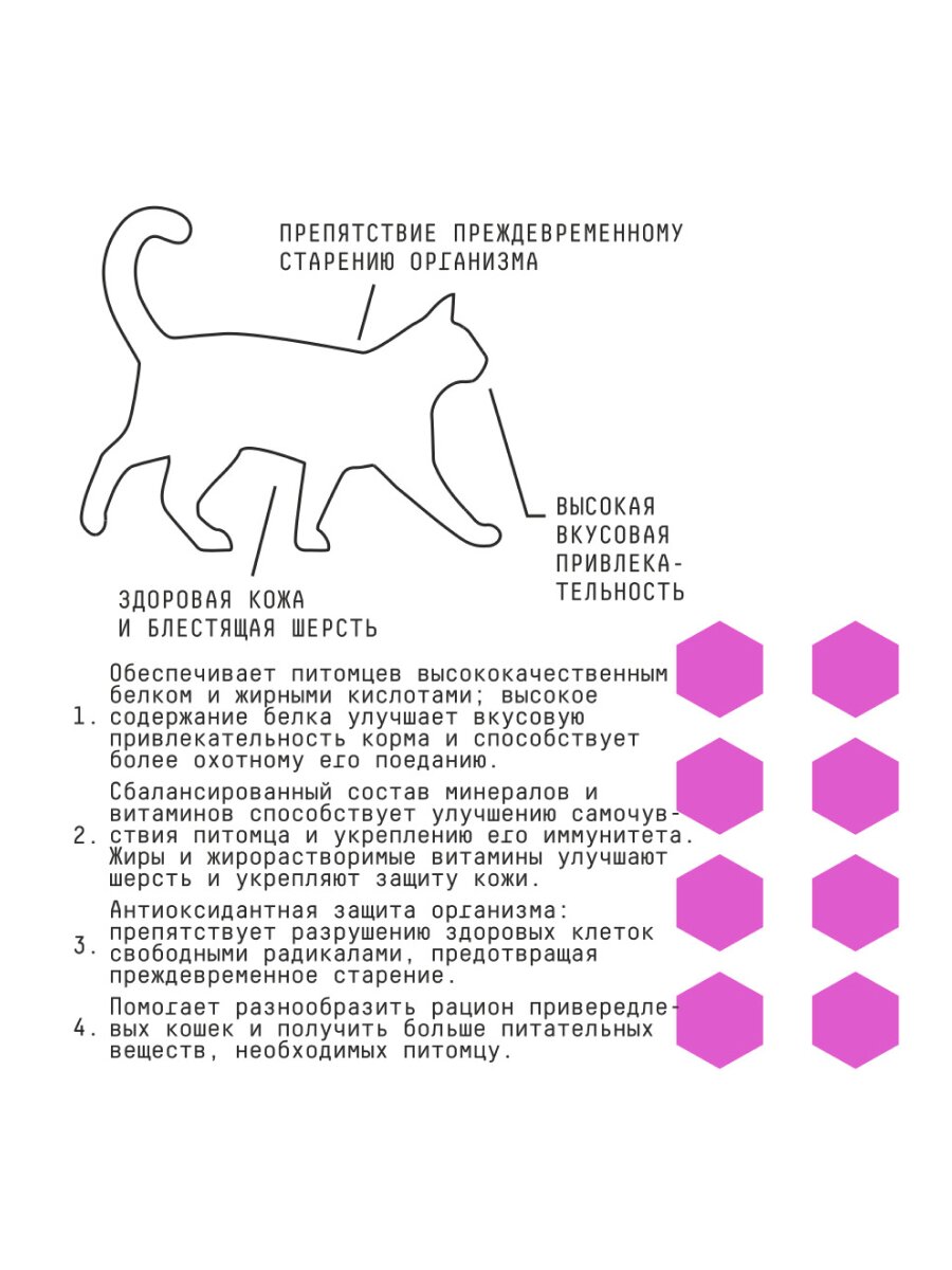 беззерновой, гипоаллергенный, для беременных / кормящих кошек, для вывода шерсти, для живущих в помещении, для живущих на улице, для здоровья кожи и блеска шерсти, для здоровья костей и суставов, для снижения запаха стула, для стерилизованных/кастрированных, при чувствительном пищеварении, профилактика МКБ, профилактика зубного камня, профилактика избыточного веса