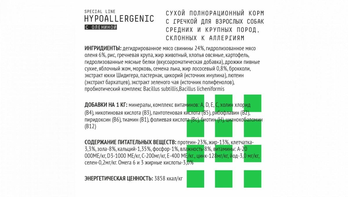 Питомцев начинают приучать к новой пище с 3-4 недель. В первое время сухие корма необходимо смачивать водой или молоком. По мере подрастания, постепенно уменьшают количество жидкости. После отъёма от матери необходимо кормить специальными кормами, предназначенными для растущего организма Далее переход по схеме. Необходимо постоянное наличие воды. Ингредиенты: дегидрированное мясо свинины 24%, гидролизованное мясо оленя 6%, рис, гречневая крупа, жир животный, хлопья овсяные, картофель, гидролизованные мясные белки (вкусоароматическая добавка), дрожжи пивные сухие, яблочный жом, морковь, семена льна, жир лососевый 0,8%, брокколи,экстракт юкки Шидигера, пастернак, цикорий (источник инулина), лютеин (экстракт бархатцев),экстракт зеленого чая (источник полифенолов), пробиотический комплекс Bacillus subtillis,Bacillus licheniformis. Витамины: минералы,комплекс витаминов: А,D, Е,С, холин хлорид (В4), никотиновая кислота (В3), пантотеновая кислота (В5), рибофлавин (В2), пиридоксин (В6), тиамин (В1), фолиевая кислота (Вс), биотин (Н), цианокобаломин (В12). Питательные вещества: протеин-23%, жир-13%, клетчатка-3.3%, зола-8%, кальций -1.35%, фосфор-1%, влажность-8%, витамины: А-20 000МЕ/кг,D3-1000 МЕ/кг,С-200мг/кг,Е -400 МЕ/кг.,цинк -128мг/кг,йод-3,0 мг/кг,селен-0,2мг/кг.Омега 6 и 3 жирные кислоты –3.0%.