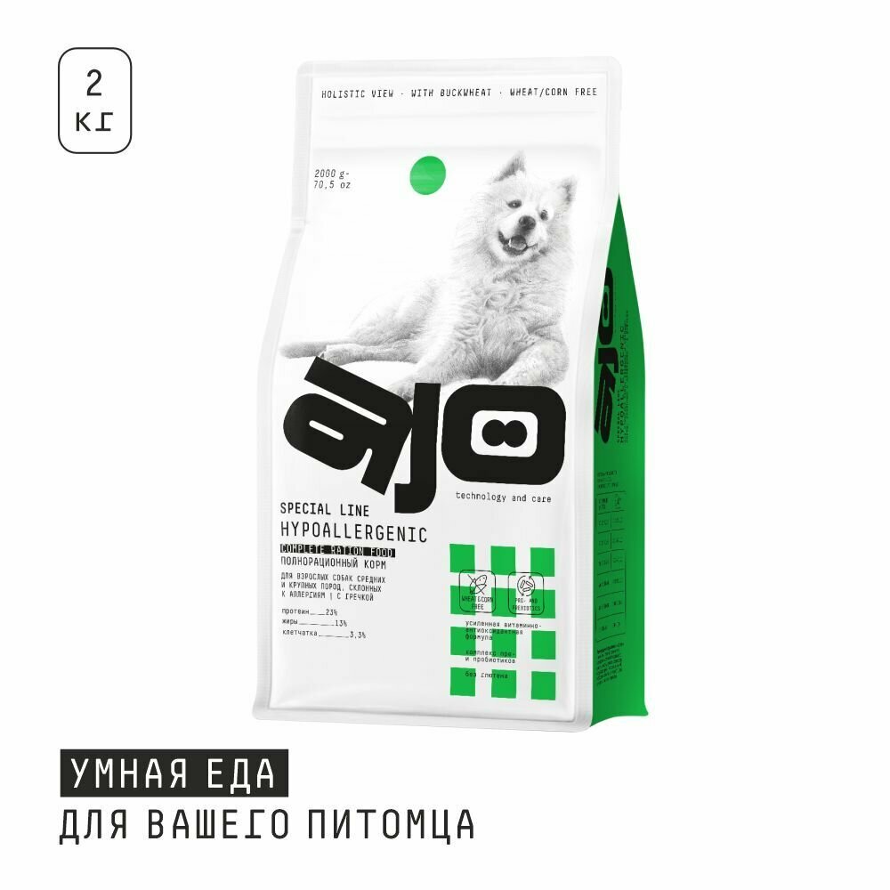 Полнорационный сухой корм AJO для взрослых собак средних и крупных пород для профилактики проявлений аллергии и нормализации пищеварения с олениной и гречкой.