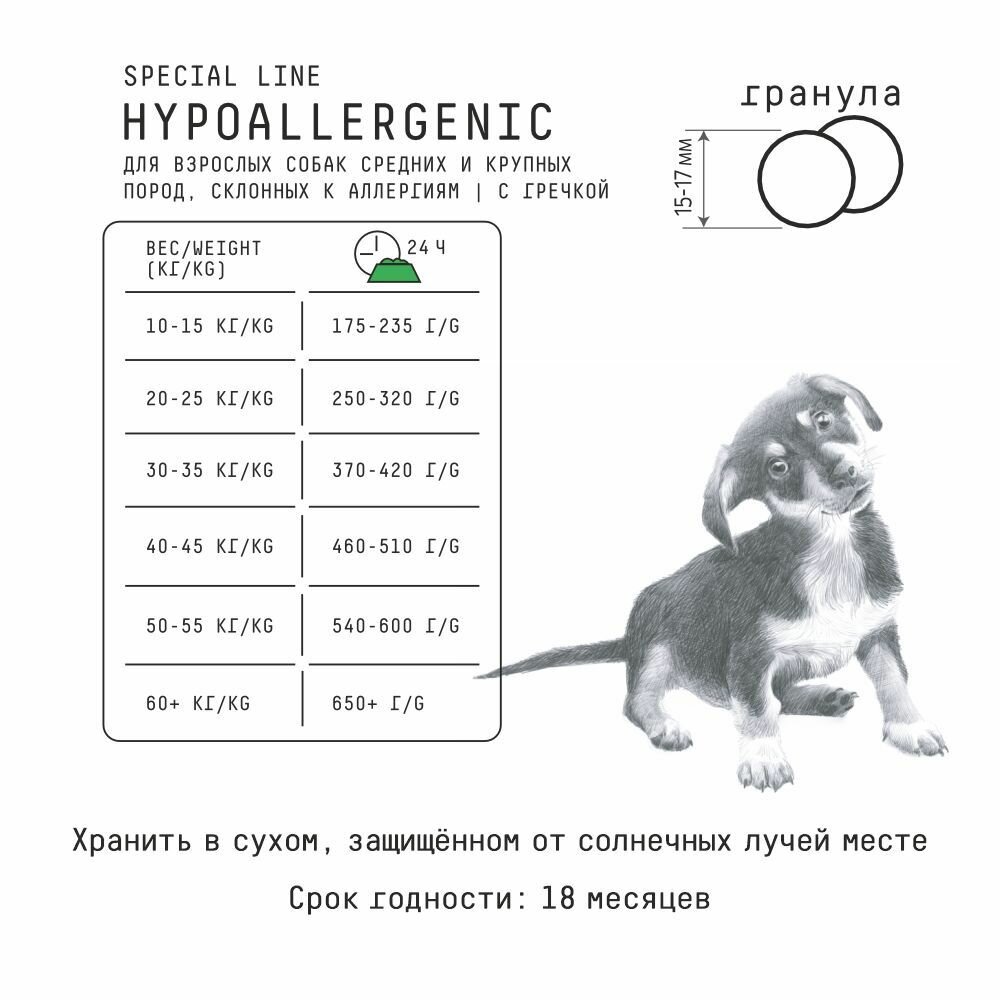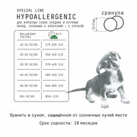Формула корма разработана с учетом индивидуальных потребностей собак, не содержит кукурузу и пшеницу, наполняющих желудок животных, создавая эффект ложной сытости, и повышающих общий процент белка в корме. При этом сам по себе и кукурузный и пшеничный белки (иначе глютен) неполноценны по аминокислотному составу и часто вызывают аллергию у питомцев.