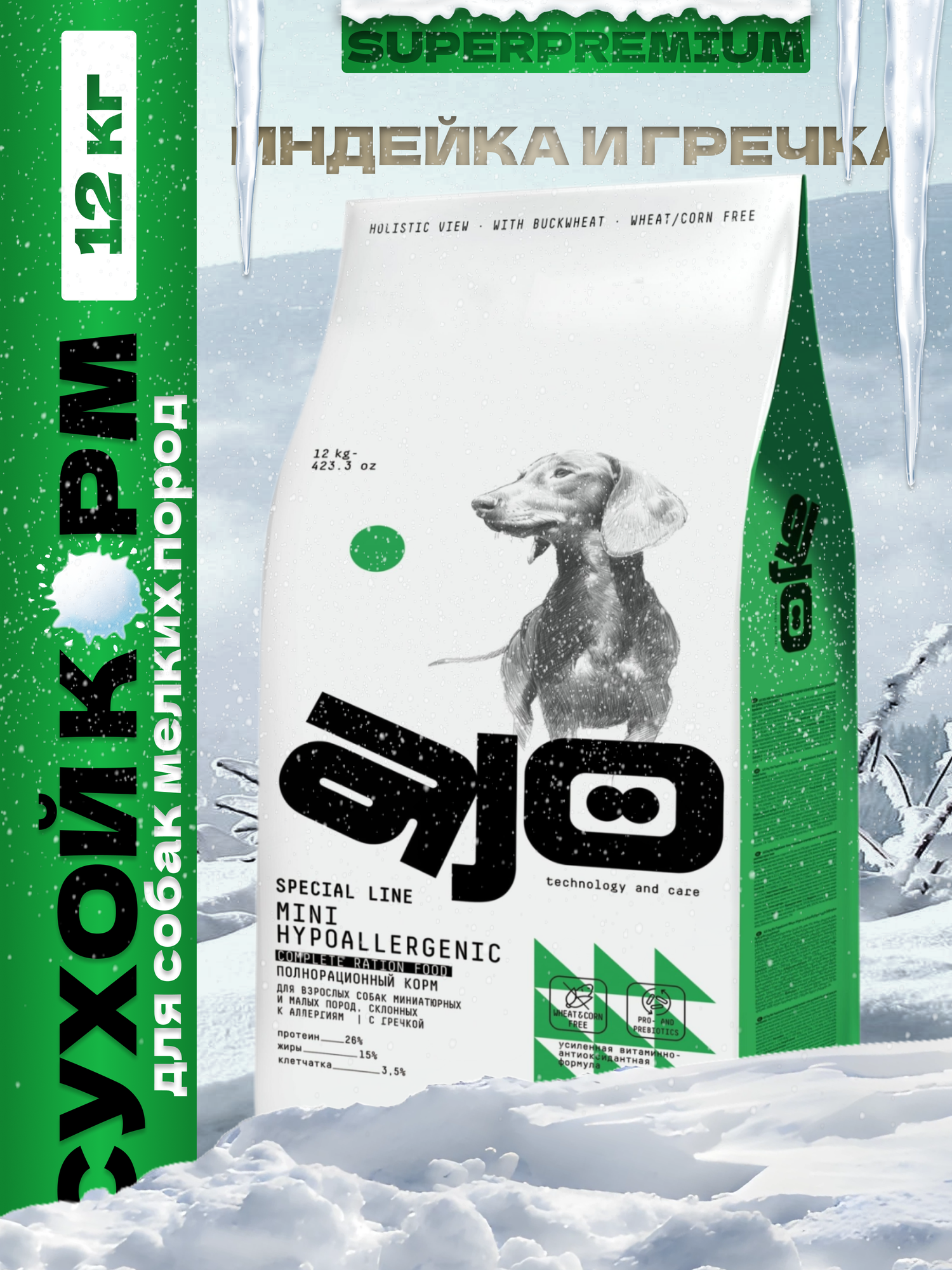 AJO Mini Hypoallergenic Сухой полнорационный корм с гречкой для взрослых собак миниатюрных и малых пород, склонных к аллергиям 12 кг. Легкоусвояемые белки, отсутствие глютена и комплекс про- и пребиотиков для профилактики проявлений аллергии и нормализации пищеварения.