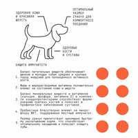 Баланс питательных веществ обеспечивает щенков и молодых собак средних и крупных пород энергией для полноценного активного роста. Жиры и жирорастворимые витамины положительно влияют на состояние кожи и шерсти. Баланс минеральных веществ и витаминов (кальция, фосфора, витамина D) в комплексе хондропротекторами способствует формированию крепких костей и помогает в профилактике заболеваний суставов. Пребиотики благотворно влияют на микрофлору ЖКТ, поддерживая местный иммунитет. Размер гранул препятствует чрезмерно быстрому заглатыванию корма, что способствует оптимальному насыщению и помогает очищать зубы.