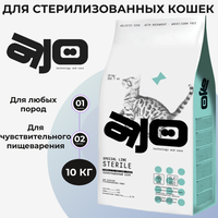 AJO Sterile Сухой полнорационный корм для активных стерилизованных кошек с высоким содержанием белка 10 кг. Профилактика мочекаменной болезни для стерилизованных кошек за счет оптимизированной минерализации рациона.