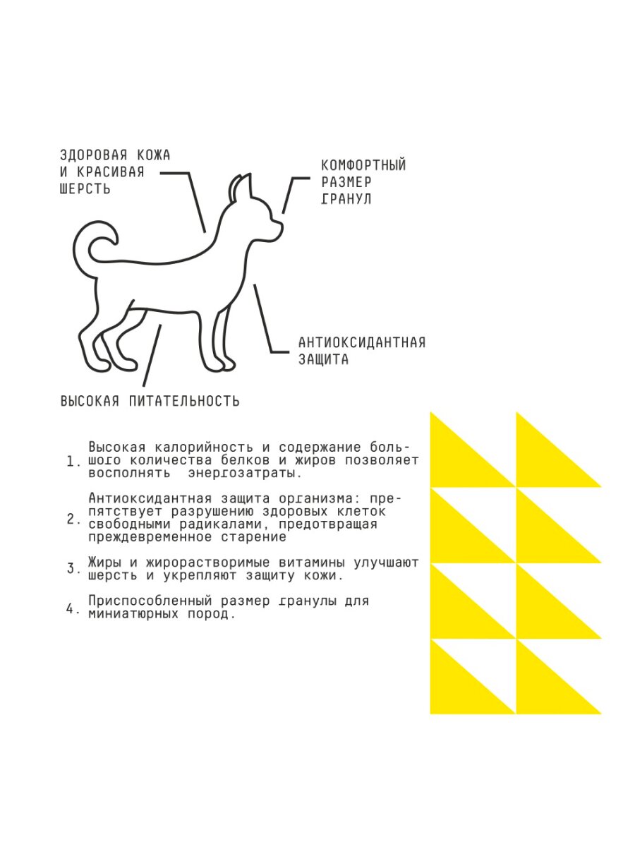 Высокая калорийность и содержание большого количества белков и жиров позволяют восполнять энергозатраты вашего питомца. Это особенно важно для поддержания активности и здоровья миниатюрных пород собак.