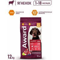 Сухой корм AWARD ALL BREED PUPPY для щенков от 1 месяца, беременных и кормящих сук всех пород с ягненком и индейкой с добавлением яблока и черники.