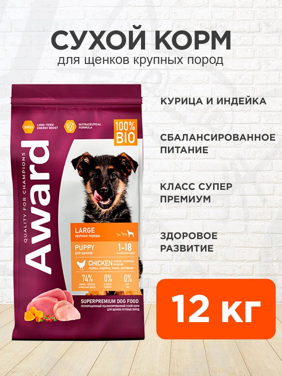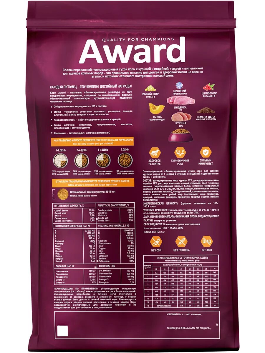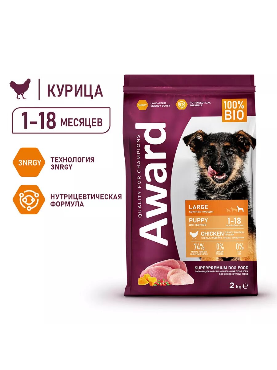 Сухой корм AWARD для щенков от 1 месяца крупных пород с курицей и индейкой с добавлением тыквы и шиповника 2 кг. Корм изготовлен из 100% натуральных ингредиентов по инновационной формуле — это обеспечивает комплексную нутрицевтическую поддержку организма питомца. При изготовлении корма использовалась технология 3NRGY — сочетание полезных углеводов, дающее длительный запас энергии и чувство сытости. Корм обогащен полиненасыщенными жирными кислотами, которые повышают качество шерсти и укрепляют иммунитет. Пробиотики и пребиотики помогают сохранять естественный баланс кишечной микрофлоры и способствуют оптимальному усвоению питательных веществ. В состав добавлена тыква — источник витаминов и флавоноидов, способствующих снижению риска образования раковых клеток. Без красителей и консервантов.